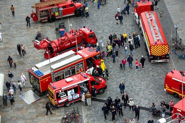 Schon vor der offiziellen Eröffnung um 11:00 Uhr wurden die ausgestellten Fahrzeuge von Besuchern der Feuerwehrmeile und Lüneburger Bürgern beim Stadtbummel interessiert betrachtet. Ein Highlight für viele Kinder war es natürlich einmal in einem Feuerwehrauto zu sitzen. Aber auch die Eltern und andere Besucher waren sehr interessiert an unserem Gerätewagen, dessen Beladung wenig mit den normalen Löschfahrzeugen gemeinsam hat. So gab es neben vielen strahlenden Kinderaugen auch jede Menge Fragen und Gespräche. Als Besuchermagnet erwies sich dabei ein am Außenspiegel aufgehängter Chemikalienschutzanzug, der viele Blicke auf sich zog.