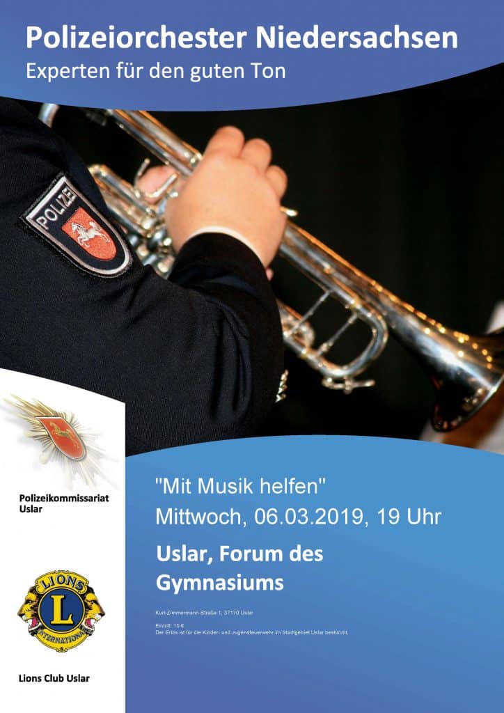 Das Lions Club Hilfswerk Uslar Uslar sowie das Polizeiorchester Niedersachsen laden für Mittwoch, 6. März, zu einem Benefizkonzert ein. Beginn ist um 19 Uhr im Forum des Gymnasiums Uslar. Der Erlös kommt in diesem Jahr den Kinder- und Jugendfeuerwehren aus dem Stadtgebiet Uslar zugute. Karten für das Konzert kosten 15 Euro.
