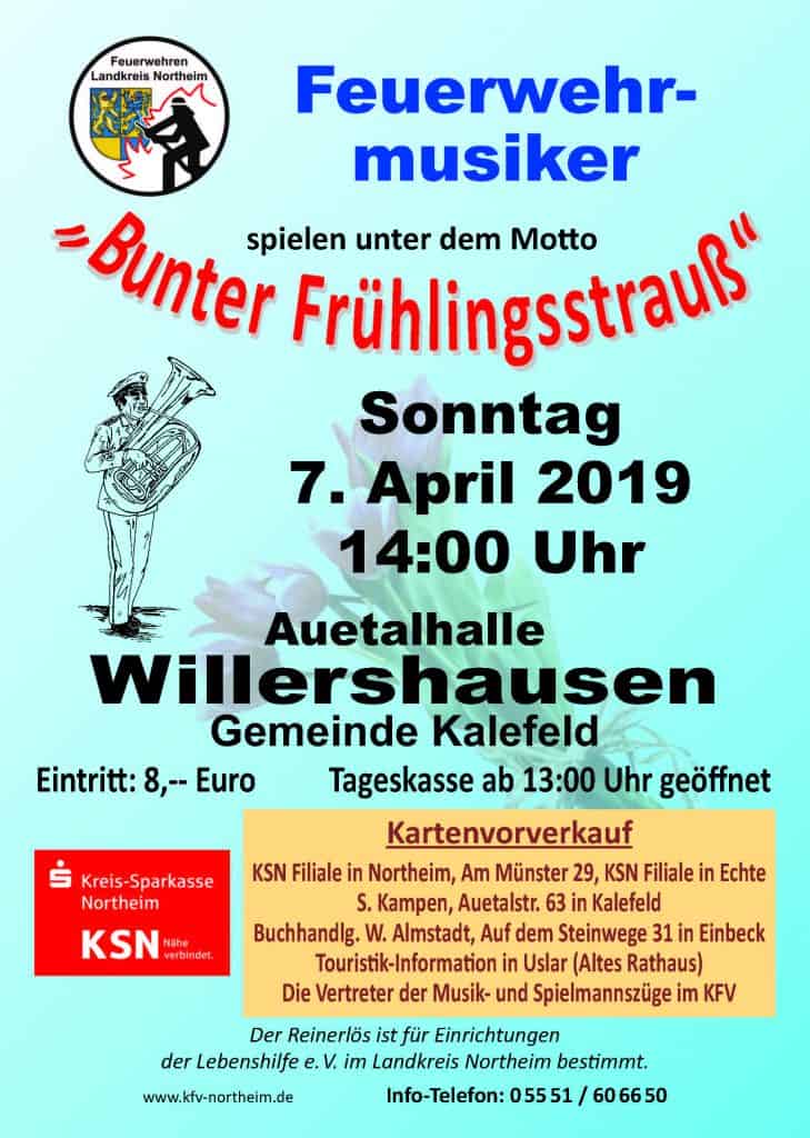 Am Sonntag, 7. April, mit Beginn um 14 Uhr geben die Musik- und Spielmannszüge der Freiwilligen Feuerwehren im Landkreis Northeim ein Gemeinschaftskonzert. Ort der Veranstaltung ist dieses Mal die Auetalhalle in Willershausen in der Gemeinde Kalefeld.