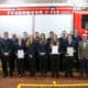 Zum Foto: Neue Führung und Gratulanten: Abschnittsbrandmeister Carsten Winkler, Bürgermeister Jens Meyer, Gemeindebrandmeister Karsten Müller, „Hans-Georg Maulhardt, Frank Becker, Michael Mitzlaff und Ortsbürgermeisterin Heike Köchermann. (Foto: Feuerwehr Oldershausen)