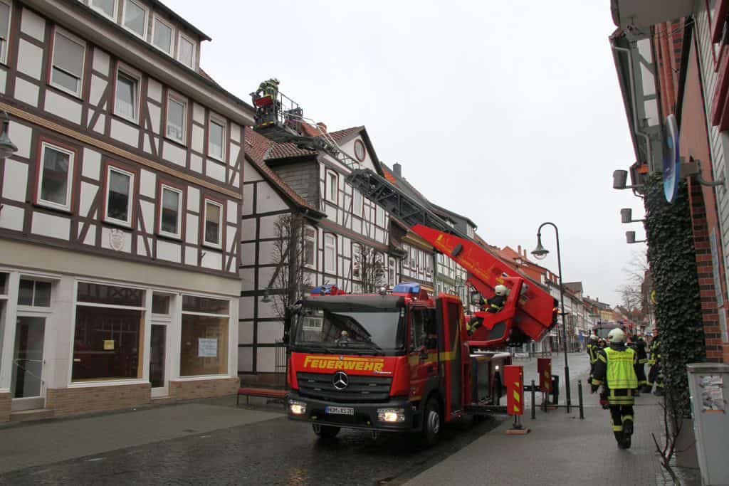 Zu einer Hilfeleistung zur Gefahrenabwehr wurde die Schwerpunktfeuerwehr Northeim am 10.03.2019 gegen 12:54 Uhr von der Einsatzleitstelle Northeim über Digitale Funkmeldeempfänger alarmiert. In der Northeimer Fußgängerzone Breite Straße Ost drohten von zwei Häusern lose Dachziegel vom Dach auf die Straße zu fallen, zuvor waren bereits einige Ziegel herabgefallen. Mit der Drehleiter der Stadt Northeim und der Landkreis Drehleiter wurden die Gefahrenstellen von den Feuerwehrleuten aus dem Korb der Drehleiter beseitigt.