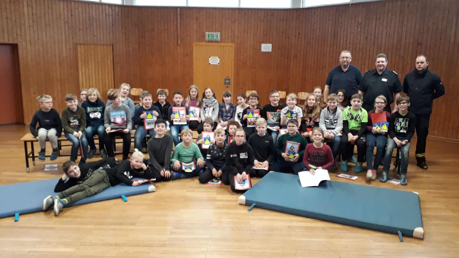 Nach einer kurzen Begrüßung wurden die Kinder nach Ihrem Wissensstand abgefragt, wobei es z.B. um das Feuer als Freund oder Feind ging. Der richtige Umgang mit Zünd- bzw. Streichhölzern und welche Sicherheitsregeln dabei zu beachten sind wurde besprochen. Den Kindern und Lehrkräften wurde das Verhalten im Brandfall nahgebrach – mit der wichtigen Botschaft, dass man sich auf keinen Fall im Zimmer oder Haus verstecken darf. Weitere Themen im Programm waren, welche Aufgaben hat die Feuerwehr? Wie setze ich den Notruf ab, welche Telefonnummer muss ich wählen? Welche Ausrüstung hat eine Feuerwehrfrau bzw. ein Feuerwehrmann. Um den Kindern die Ängste zu nehmen, hat sich ein Kamerad als Atemschutzgeräteträger soweit ausgerüstet als würde er in ein brennendes oder verqualmtes Gebäude gehen. Dem Brandschutzerzieherteam war es wichtig, dass die Kinder das Atemgeräusch hören und niemand Angst haben muss, da die Feuerwehr nur helfen möchte.