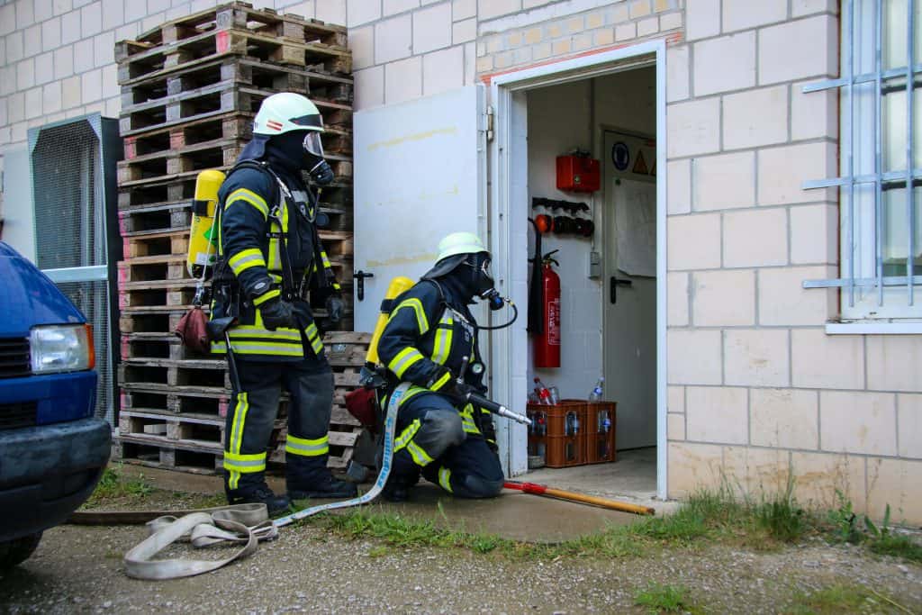 Nachdem die Wasserversorgung, durch eine nahe gelegenen Zisterne aufgebaut wurden war, ging ein Trupp zur Brandbekämpfung vor.