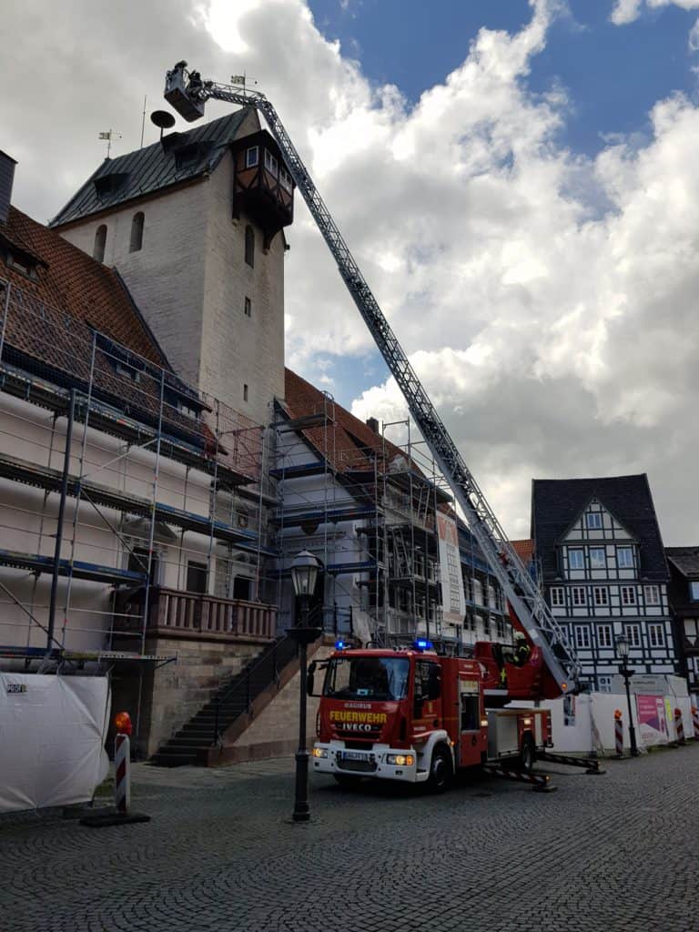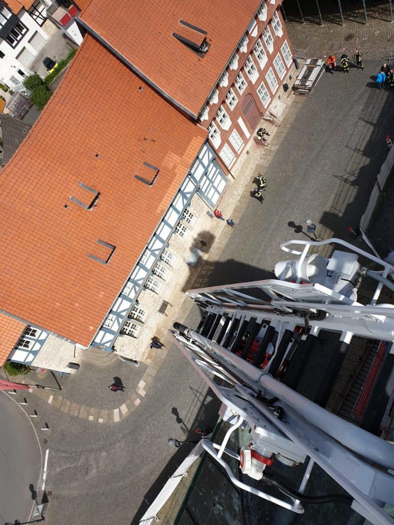 Die Ausbilder Jens Schrader und Dennis Ahrenhold hatten sich im Vorfeld für die weitere praktische Ausbildung an verschiedenen Objekten in der Stadt Bad Gandersheim Szenarien überlegt, die es für die 9erfahrenen Drehleitermaschinisten und 4 zukünftige Drehleitermaschinisten zu bewältigen gab.