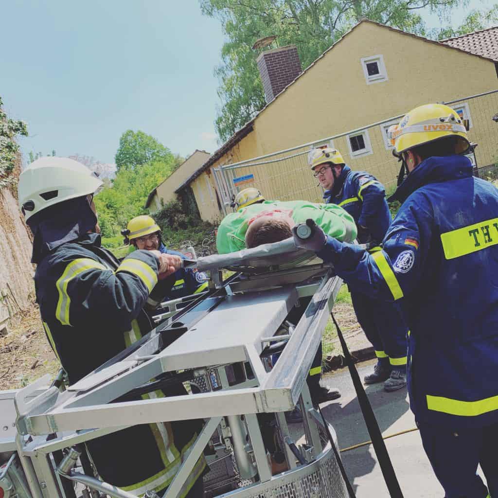 Im 1. Obergeschoss konnten die THW Kräfte auch zwei Personen lokalisieren und dann mit Hilfe der Drehleiter ins Freie bringen. Ungewöhnlich war hier die Arbeit des THW gemeinsam mit der Drehleiter der Feuerwehr, da dieses doch keine Alltägliche Arbeit des Technischen Hilfswerkes ist.