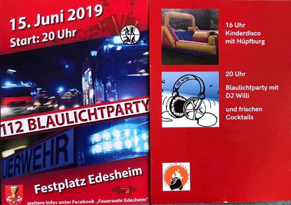 Blaulichtparty für alle heißt es am Samstag, 15. Juni, bei der Feuerwehr Edesheim. Sie feiert ihren 112. Geburtstag und lädt dazu auf den Festplatz ein. Ab 16 Uhr gibt es eine Kinderdisco sowie eine Hüpfburg, Ab 20 Uhr startet die Blaulicht-Party mit DJ Willi. Für Essen und Getränke ist gesorgt, außerdem gibt es frische Cocktails, heißt es in einer Mitteilung. Alle Interessierten sind zur Veranstaltung eingeladen.