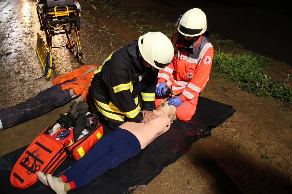 Um circa 19:20 Uhr hieß es dann Übungsstart durch Ortsbrandmeister Jan Bialaschewitz. Nach Eintreffen der ersten Kräfte vom Deutschen Roten Kreuz, nahmen diese sofort eine Erkundung vor und stellten Kontakt zu den verunfallten „Patienten“ her.