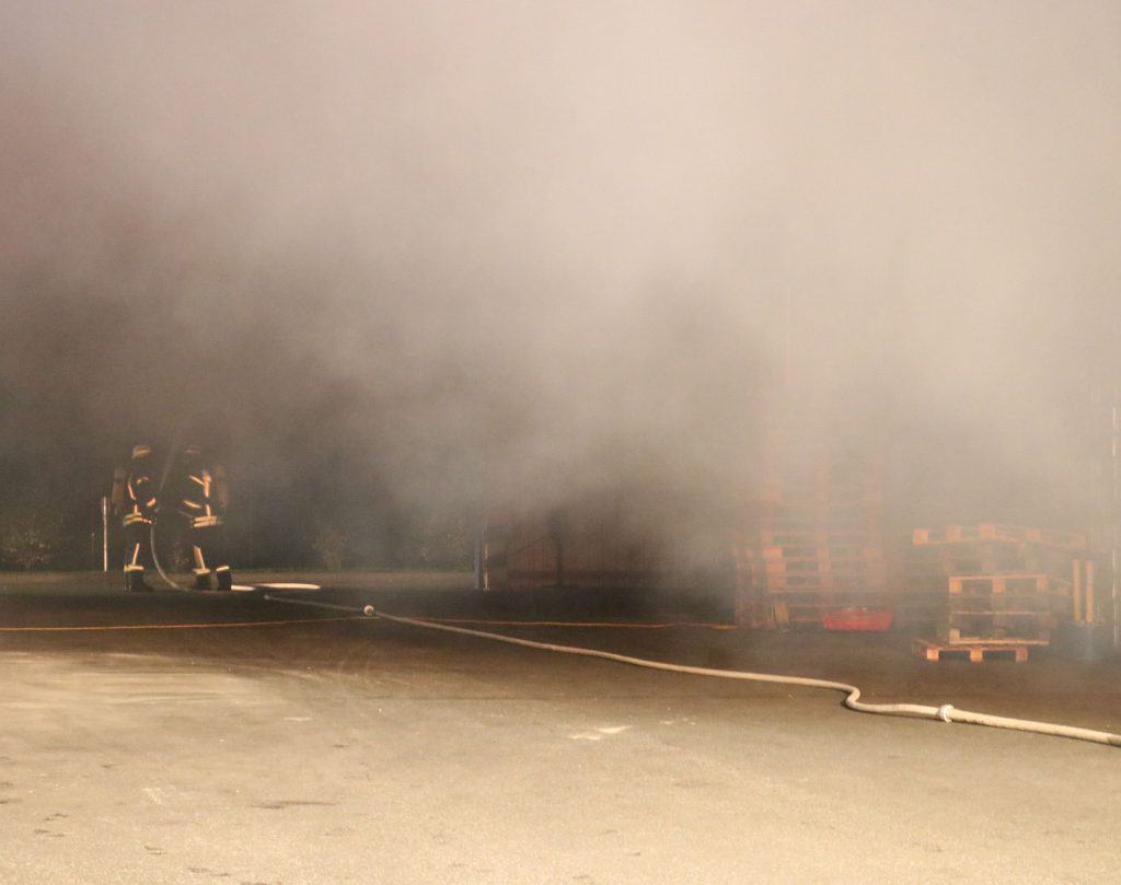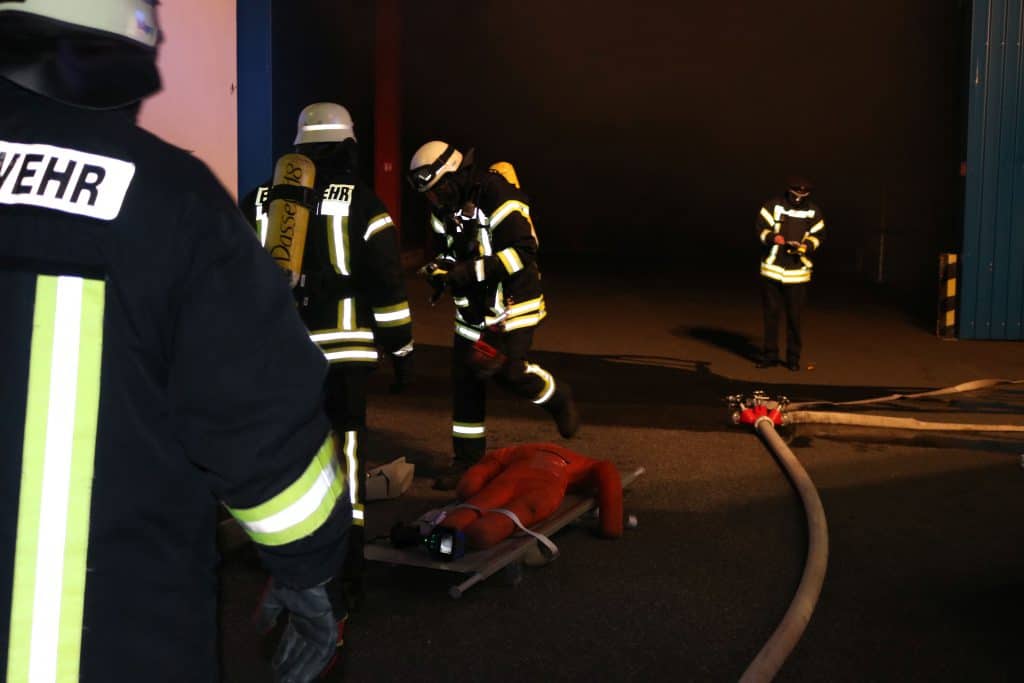 Der Fokus der Maßnahmen lag zuerst vorrangig im Bereich der Menschenrettung. Atemgeräteträgertrupps rücken in den mit einer Nebelmaschine verqualmten Gebäudeteil vor, um die vermissten Mitarbeiter in Form von Übungspuppen zu retten. Parallel erfolgte der Aufbau der weiteren Wasserversorgung. Dafür musste zeitweise die Straße „Am Burgberg“ für den Verkehr gesperrt werden. Weiterhin wurde die Abriegelung der angrenzenden Betriebsbereiche sichergestellt. Zum Einsatz kamen auch eine Wärmebildkamera, um die vermissten Personen schneller anhand ihrer Wärmesignatur finden und etwaige Wärmeveränderungen an den Nachbargebäuden feststellen zu können. Ferner wurde die Drehleiter der Ortsfeuerwehr zur Brandbekämpfung eingesetzt.