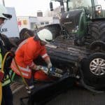 Der PKW kam auf der Seite liegend vor dem Trecker zum Stehen. Der Fahrer wurde schwer verletzt und in seinem Fahrzeug eingeklemmt.