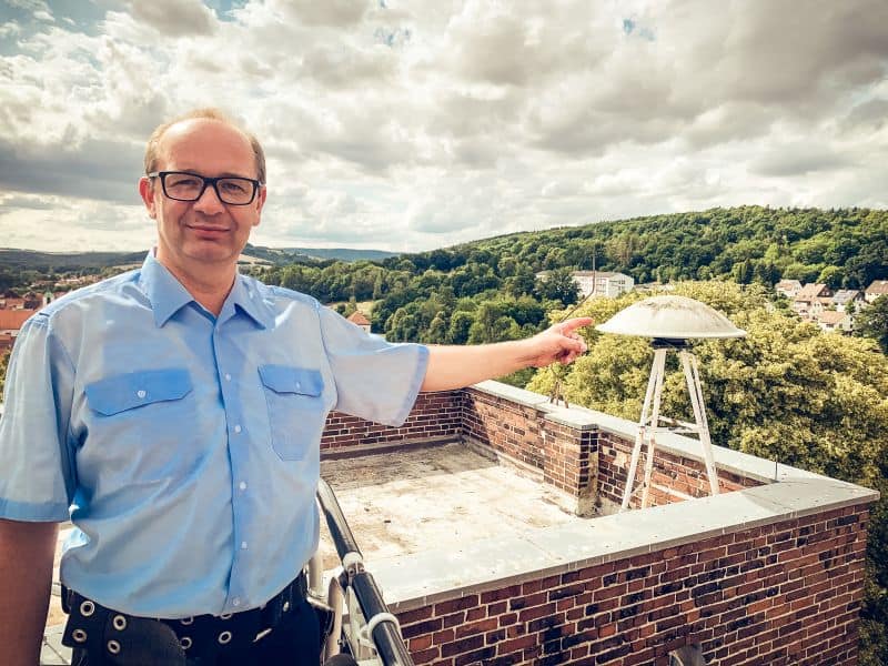 Kreisbrandmeister Marko de Klein zeigt die Sirene auf dem Dach der Bad Gandersheimer Grundschule.