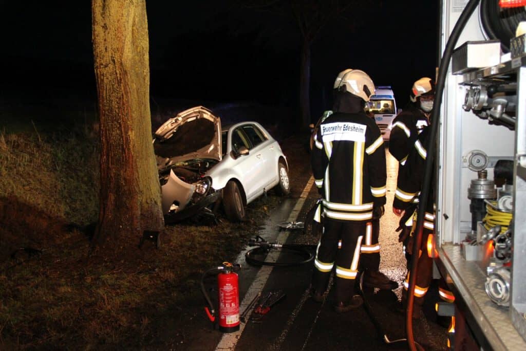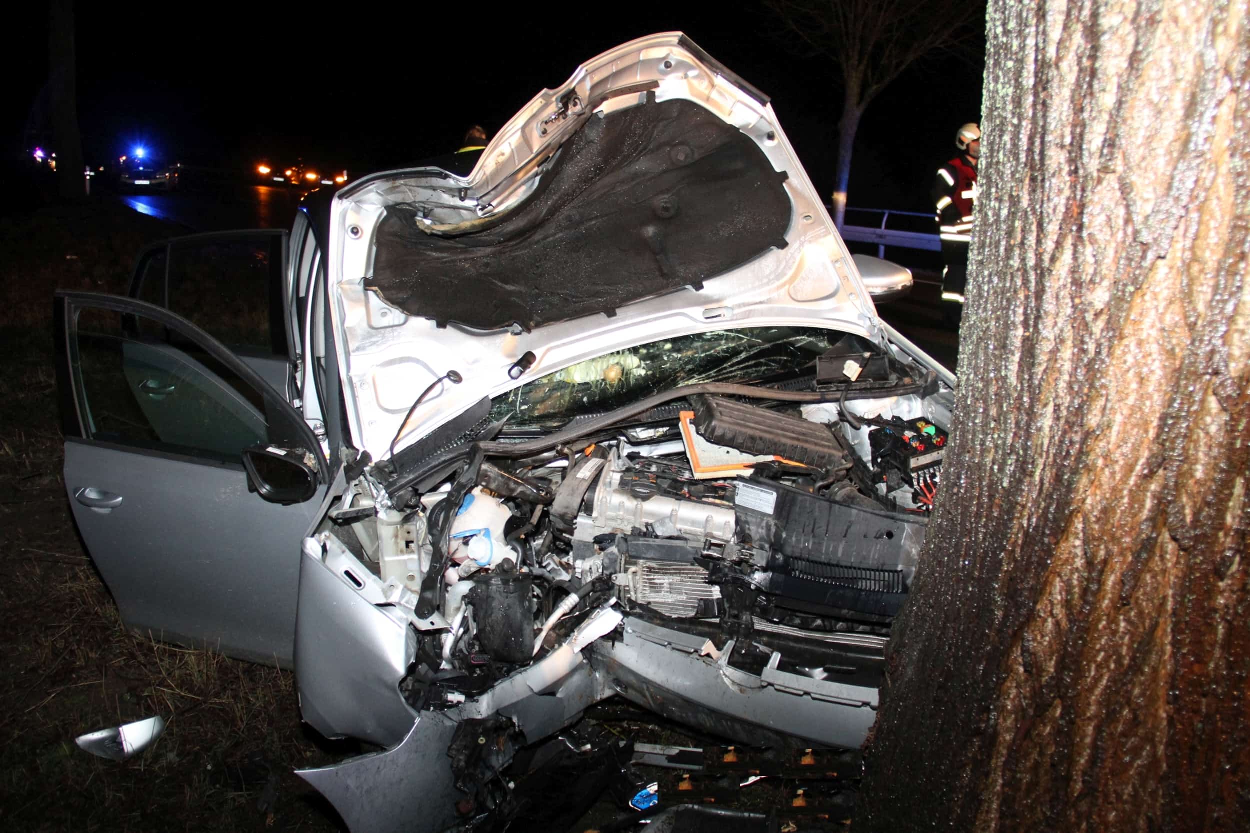 Aus dem Motorraum kam Qualm heraus. Bei Ankunft der ersten Rettungskräfte stellte sich heraus, dass ein VW-Golf mit einer 46-jährigen Fahrerin und einer 19-jährigen Mitfahrerin aus noch ungeklärter Ursache rechtsseitig in den Böschungsbereich gekommen war und mit einem Straßenbaum kollidierte, aber nicht brannte.