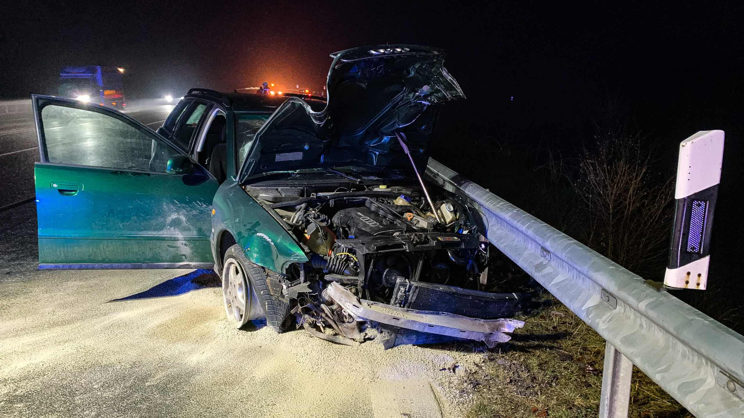 Vor Ort ergab sich folgendes Bild: Ein Pkw war aus Hardegsen in Richtung Uslar unterwegs, in Höhe der Abfahrt Schlarpe verlor er aus bisher ungeklärter Ursache die Kontrolle über sein Fahrzeug und prallte in die Leitplanke des Gegenverkehrs. Die Feuerwehr stellte den Brandschutz sicher, nahm ausgelaufene Betriebsstoffe und leuchtete die Einsatzleitstelle aus. Der Fahrer kam mit dem Rettungswagen in ein Krankenhaus.