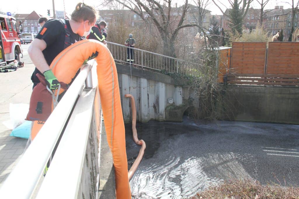Die 20 Feuerwehrleute legten auf einer Strecke von der Rückingsallee bis zum Einlauf in die Rhume drei Ölsperren und streuten Ölbindemittel davor. Teilweise war der Zugang zu dem Gewässer mit Sträuchern versperrt, da musste eine Kettensäge Abhilfe schaffen. An der dritten Ölsperre wurde festgestellt, dass noch kein Öl in die Rhume gelangt war. Die Ölsperren werden noch einige Tage in dem Kanal liegenbleiben und mehrmals täglich kontrolliert. Die Feuerwehr, Polizei und ein Mitarbeiter der Unteren Wasserbehörde des Landkreises Northeim sind auf der Suche nach der Ursache des Ölfilms.
