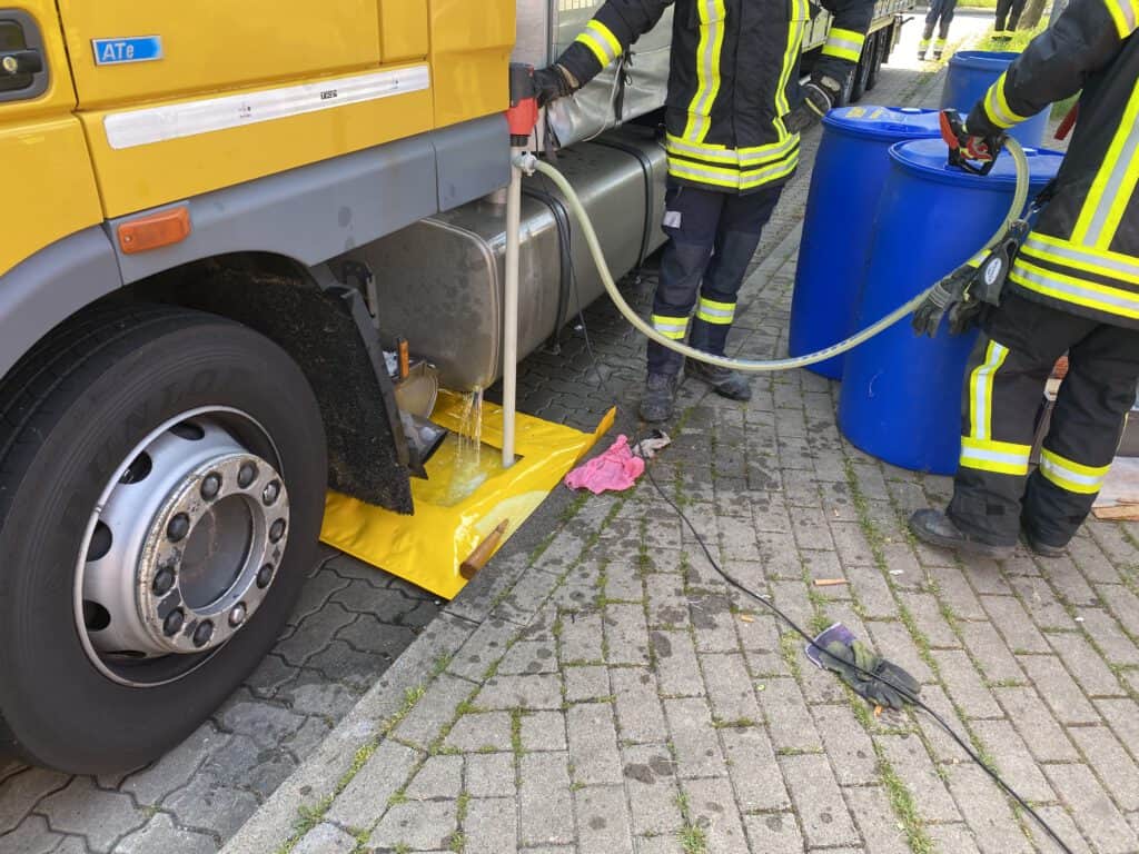 Durch die Einsatzkräfte wurde der auslaufende Dieselkraftstoff aus dem circa 600 Liter großen Tank aufgefangen und in spezielle Behälter abgefüllt. Das Leck wurde anschließend verschlossen, um einen weiteren Austritt vorzubeugen.