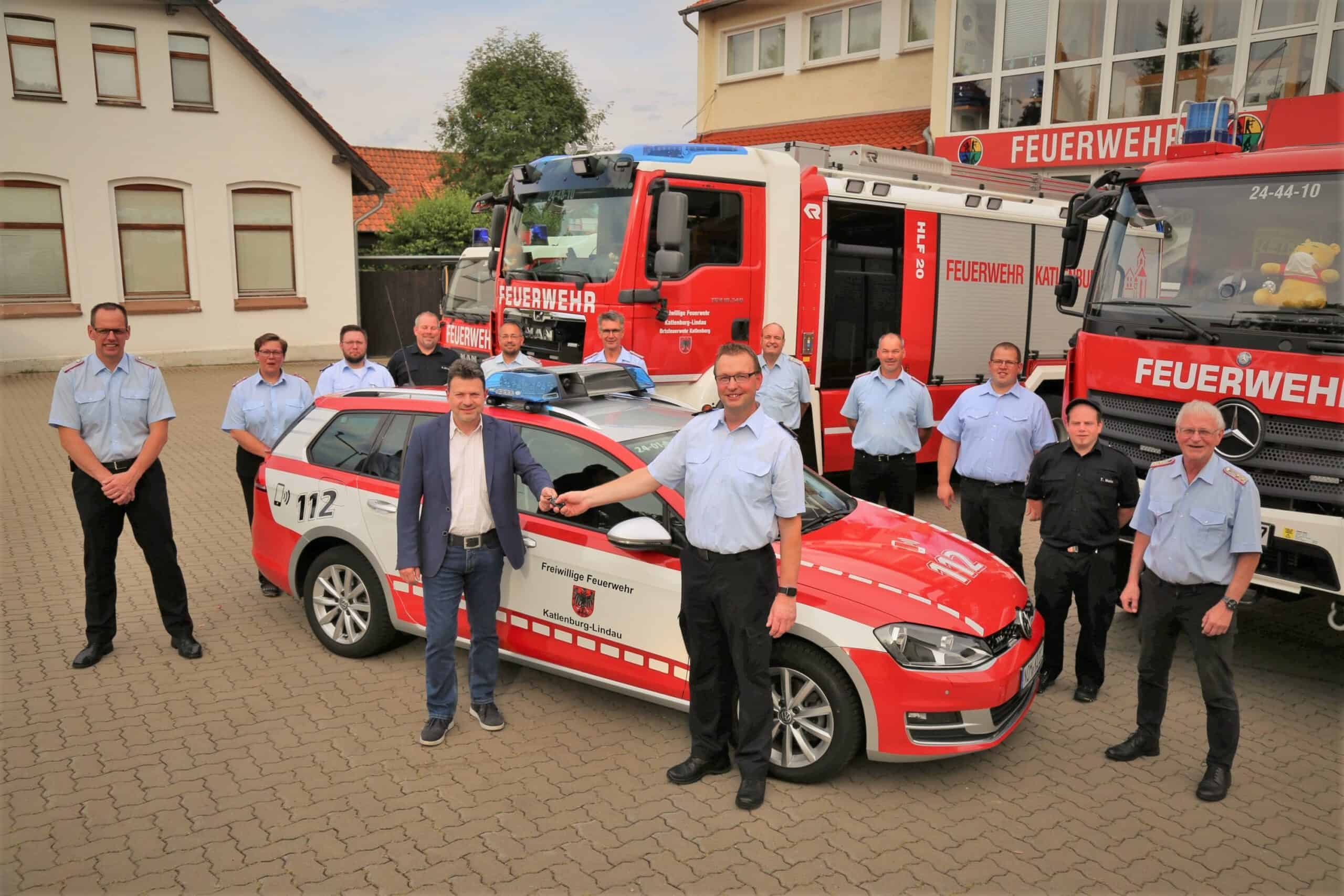Eine etwas andere, aber ansprechende Beklebung wurde an dem Fahrzeug angebracht, so dass der Kommandowagen für das Gemeindekommando, sprich den Gemeindebrandmeister im Beisein von Vertretern von Brandschutzausschuss, Rat, Verwaltung und Gemeindekommando der Feuerwehren Katlenburg-Lindau durch Bürgermeister Uwe Ahrens im Wege einer Schlüsselübergabe an Gemeindebrandmeister Sven Helmold offiziell in Dienst gestellt wurde.