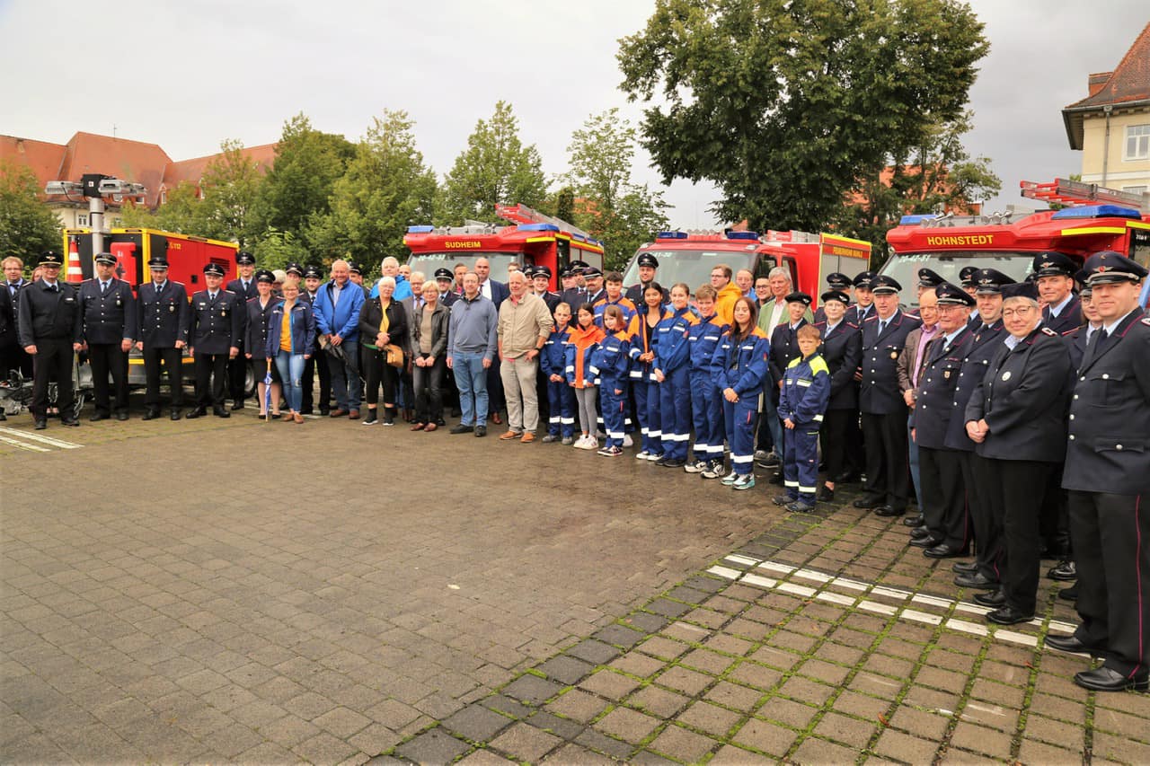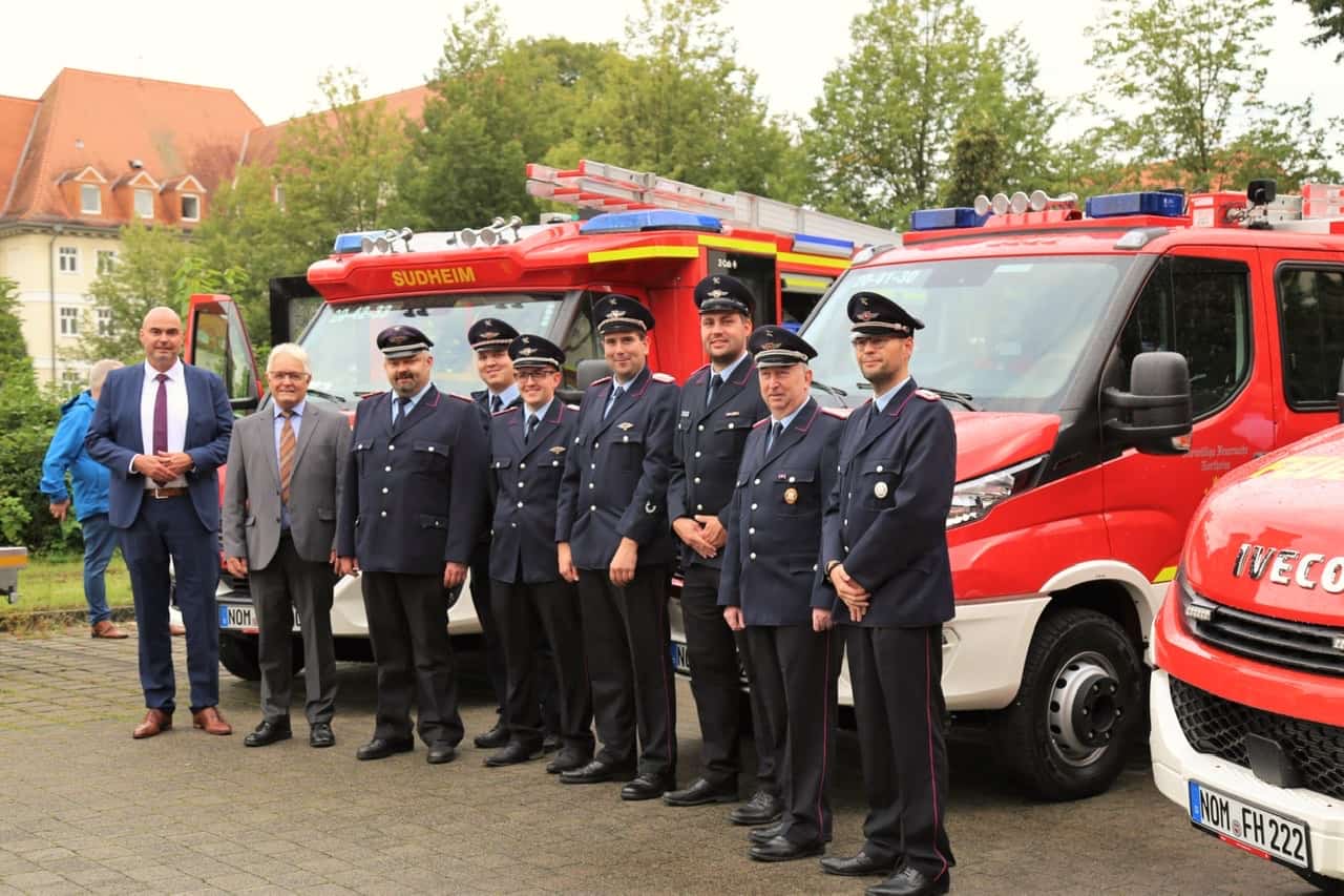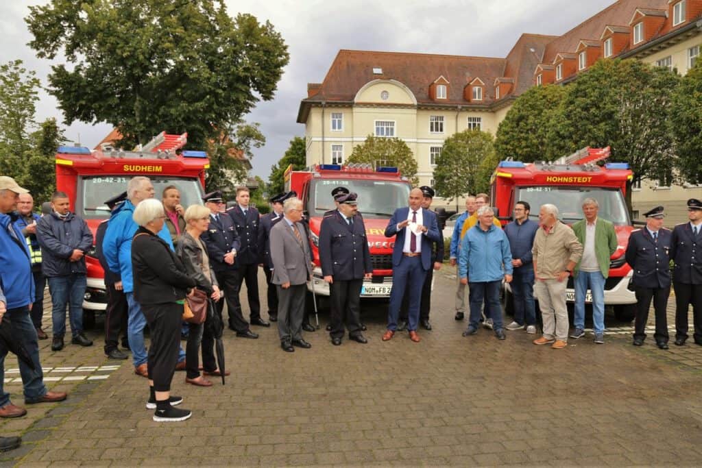 „Katastrophen können uns auch in Südniedersachsen ereilen, deshalb werden wir in der nächsten Zeit auch stabsmäßig üben, um bestmöglich auf das, was hoffentlich nie kommt, vorbereitet zu sein“, sagte Northeims Bürgermeister Simon Hartmann bei der Feierstunde unter freiem Himmel. Die Corona-Pandemie hatte die Übergabe der Fahrzeuge in offiziellem Rahmen bisher verhindert. „Dass alleine das neue MLF der Feuerwehr Sudheim vor der heutigen Übergabe schon 14 Einsätze absolviert hat, zeigt, wie dringend diese Fahrzeuge gebraucht werden“, sagte Walter Keup, Vorsitzender des Ausschusses für Wirtschaft, Verkehr und Gefahrenabwehr der Stadt Northeim.
