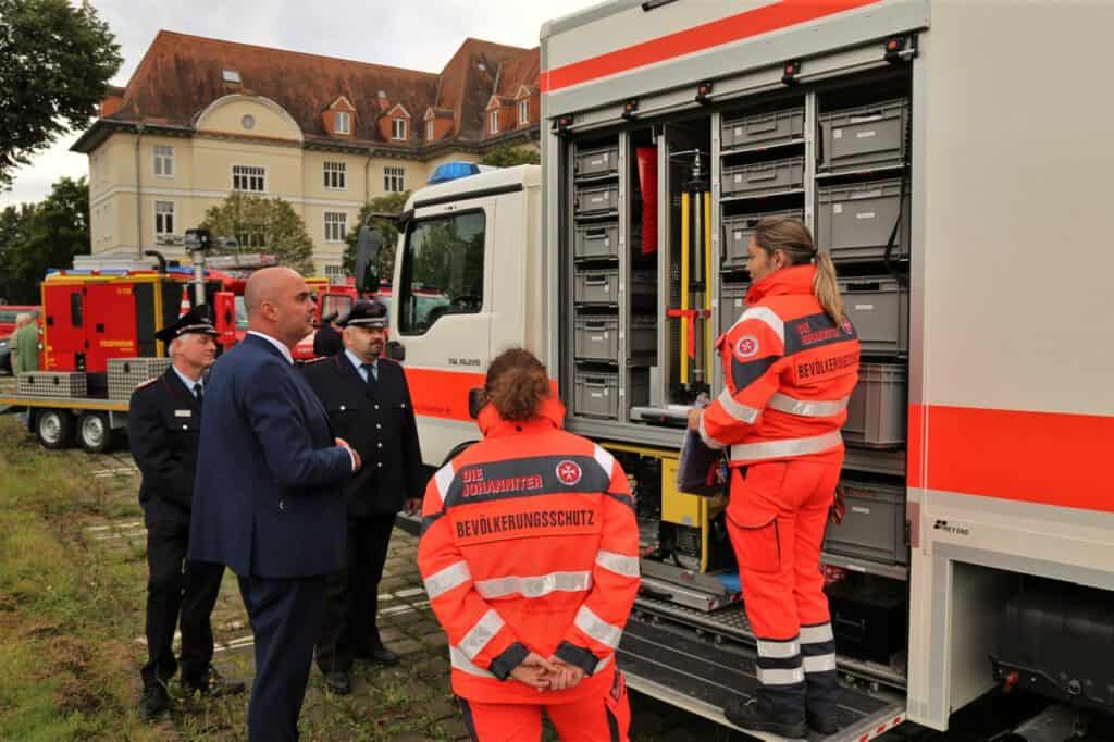 Ebenfalls bei der Fahrzeugübergabe mit ausgestellt war der Gerätewagen Sanität der Johanniter. Der zehn Tonnen-LKW mit flexiblem Beladungskonzept ist vielseitig einsetzbar, um im Bevölkerungsschutz je nach Einsatzlage schnell und dynamisch helfen zu können.