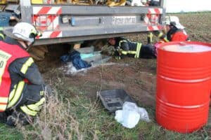 Katlenburg (hl) Die Ortsfeuerwehren Katlenburg und Wachenhausen wurden am 14.11.2022 gegen Mittag zu einer Hilfeleistung alarmiert. Auf einem Rübenfeld an der Bundesstraße 241 Katlenburg-Hammenstedt hatte ein Rübenroder einen Technischen Defekt an der Diesel-Kraftstoffleitung. Nachdem der Fahrer dieses bemerkt hatte, stellte er die Maschine ab und kümmerte sich darum, dass kein Diesel in das Erdreich eindringen konnte. Er verständigte über den Notruf die Leitzstelle in Northeim, die wiederum über Meldeempfänger die Ortsfeuerwehren verständigten. Nachdem Eintreffen der Einsatzkräfte vor Ort, dichteten sie die defekte Leitung notdürftig ab und stellten eine Zinkwanne unter den Tank. Da der Tank für eine Reparatur leer sein musste, wurde eine fahrbare Tankstation angefordert. Diese pumpte etwa 800 Liter Diesel aus dem Tank ab. Da nicht genau bekannt war, wieviel Diesel ausgeflossen war, forderte der Feuerwehr-Einsatzleiter einen Mitarbeiter der Unteren-Wasserbehörde des Landkreises Northeim an. Nach etwa zwei Stunden war der Einsatz für die Feuerwehr beendet. Für die Einsatzstellenhygiene war die Ortsfeuerwehr Wachenhausenzuständig. Bei dem Einsatz wurde ein Feuerwehrmann an der Hand verletzt. Er wurde mit einem Rettungswagen in ein Krankenhaus gebracht. Im Einsatz waren etwa 35 Einsatzkräfte von Feuerwehr, Polizei, Rettungsdienst und Umweltschutzamt.