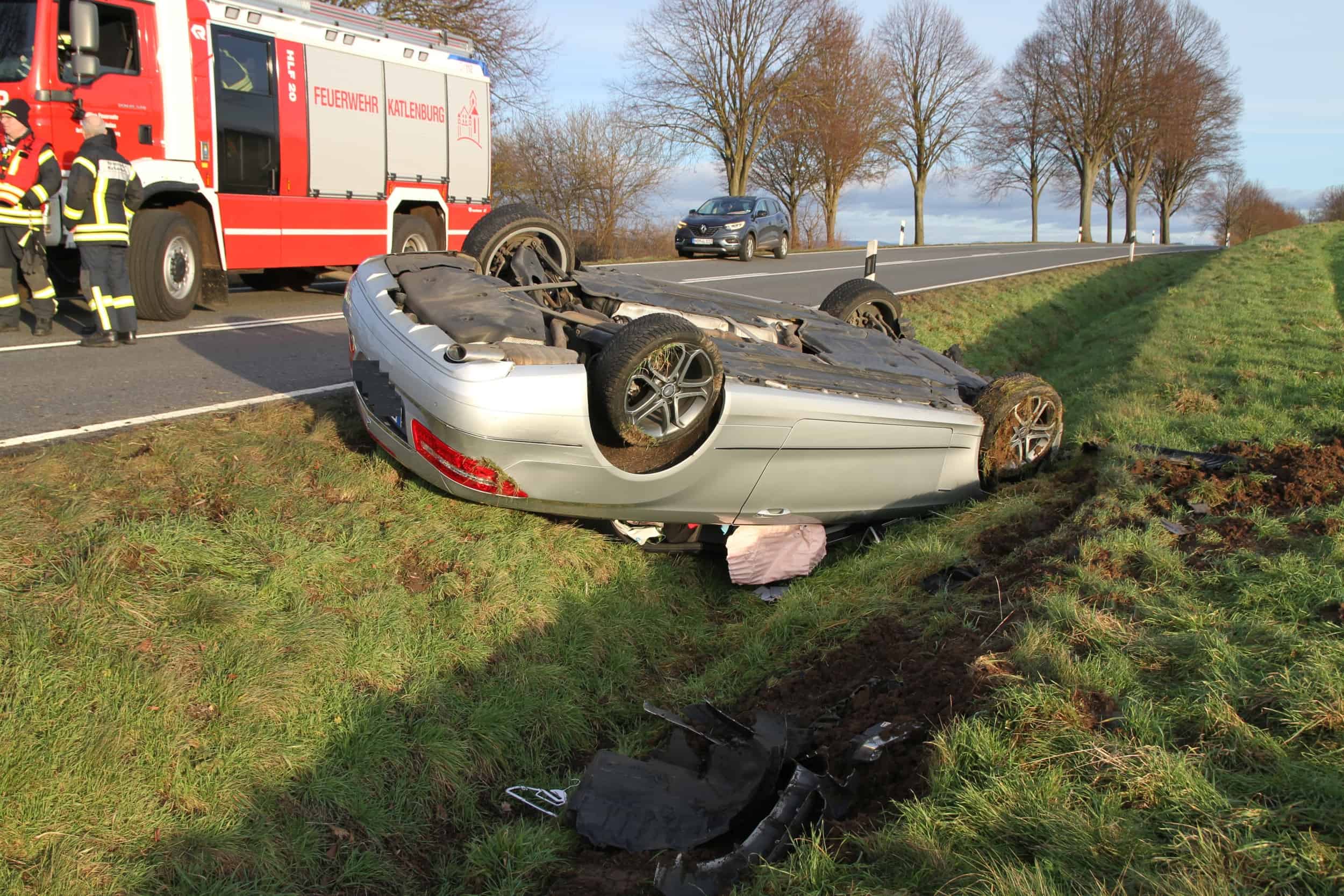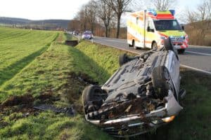 Katlenburg (hl) Die Ortsfeuerwehren Katlenburg, Berka und der Rüstwagen der Feuerwehrtechnischen Zentrale Northeim, wurden am 04.02.2023 gegen 15:47 Uhr mit dem Alarmstichwort „Verkehrsunfall mit eingeklemmter Person“ alarmiert. Weiterhin auch der Northeimer Notarzt und ein Rettungswagen vom Arbeiter-Samariter-Bund aus Nörten-Hardenberg. Auf der Bundesstraße 241 Hammenstedt in Richtung Katlenburg, war laut Polizei, ein Mercedes aus noch ungeklärter Ursache rechts von der Straße abgekommen und in den Graben gerutscht. Dort blieb in „Dachlage“ im Graben liegen. Bevor die Rettungskräfte an der Einsatzstelle angekommen waren, hatte der Fahrer, der allein im Fahrzeug saß, sein Fahrzeug verletzt verlassen. Der Fahrer wurde durch den Notarzt und den Rettungsdienst erstversorgt und anschließend mit dem Rettungswagen in ein Krankenhaus gebracht. Die Feuerwehren sicherten die Unfallstelle ab, kontrollierten ob Betriebsstoffe ausgeflossen waren und stellten den Brandschutz sicher. Der Sachschaden wird von der Polizei mit etwa 15.000 bis 20.000 Euro angegeben. Für die Dauer des Einsatzes war die Bundesstraße gesperrt. Der Verkehr wurde von der Feuerwehr umgeleitet. Im Einsatz waren etwa 25 Einsatzkräfte von Feuerwehr, Rettungsdienst und Polizei.