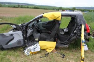 Höckelheim (hl) Ein Verkehrsunfall mit einer eingeschlossenen Person im Personenwagen forderten Feuerwehr, Rettungsdienst mit Notarzt und Polizei am 24.05.2023 gegen 16 Uhr. Auf der Kreisstraße 406 Hollenstedt zur Bundesstraße 241 in Höhe „Steinkuhle“ waren aus noch ungeklärter Ursache ein Nissan und ein Mercedes Sprinter zusammengestoßen. Nach dem Zusammenprall überschlug sich der Nissan und kam auf den Randstreifen neben der Fahrbahn zum Stehen. Die alarmierten Feuerwehrkräfte aus Northeim und Höckelheim befreiten die Frau mittels Hydraulischen Rettungsgerät aus ihrem Fahrzeug. Dazu entfernten sie die beiden Türen und dem B-Holm von der Fahrerseite.