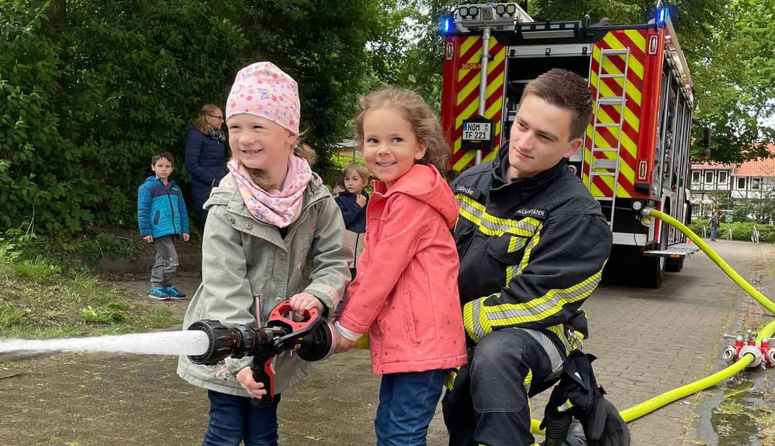 Die Feuerwehr stand vor der Tür – allerdings nicht, weil es brannte, sondern um genau dem Vorzubeugen und auf mögliche Gefahren hinzuweisen. Die Brandschutzerziehung der Kreisfeuerwehr des Landkreises Northeim konnte so mit Unterstützung der Ortsfeuerwehren aus Hardegsen und Northeim rund 80 Kindern unter anderem das Verhalten im Brandfall, das richtige Löschmittel bei verschiedenen Bränden und das Absetzen eines Notrufes erklären.