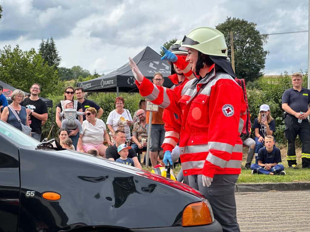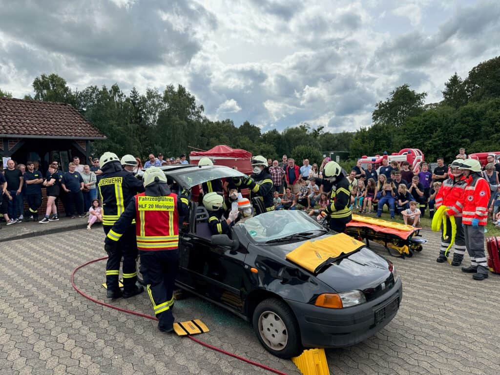 Die Feuerwehr des Moringer Ortsteils ist keineswegs eine Einrichtung, die vor Ort als Selbstverständlichkeit angesehen wird. „Als wir mit der Idee der Gründung einer Drohnengruppe an lokale Unternehmen und die Bürger herangetreten sind, haben wir eine große Unterstützung erfahren. Die Menschen stehen hinter uns, hinter ihrer Feuerwehr“, sagt Niklas Ohm, Ortsbrandmeister der Freiwilligen Feuerwehr Fredelsloh. Beim Tag der offenen Tür konnte sich die Einheit erstmals der breiten Bevölkerung präsentieren. Eine Personensuche via Wärmebildkamera konnten die Besucher auf einer Videowand der Kreisfeuerwehr live mitverfolgen. Zu den Angeboten des Tages gehörten zudem eine von Frank Fihlon, Ortsbrandmeister der Feuerwehr Moringen moderierte Schauübung. Das Vorgehen bei einem Verkehrsunfall wurde Schritt für Schritt, auch für Laien verständlich erklärt und die Herausforderungen moderner Fahrzeuge für Einsatzkräfte im Notfall nähergebracht. Dann sind die Moringer Brandschützer zu einem Realeinsatz abgerückt – zum Zimmerbrand im Maßregelvollzug in Moringen. Weitere Schauübungen zeigten die Gefahren von Fettbränden und das Vorgehen der Feuerwehr bei Brandeinsätzen. Besonderer Besuchermagnet war die Druckstation für sogenannte Rettungsdatenblätter. Sie können für jedes Fahrzeugmodell im Auto hinterlegt werden und geben der Feuerwehr bei einem Verkehrsunfall schnell und unkompliziert wertvolle Hinweise über den Standort von Airbags, Batterien und weiteren Gefahrenquellen wie zum Beispiel Hochvoltleitungen bei Elektroautos.