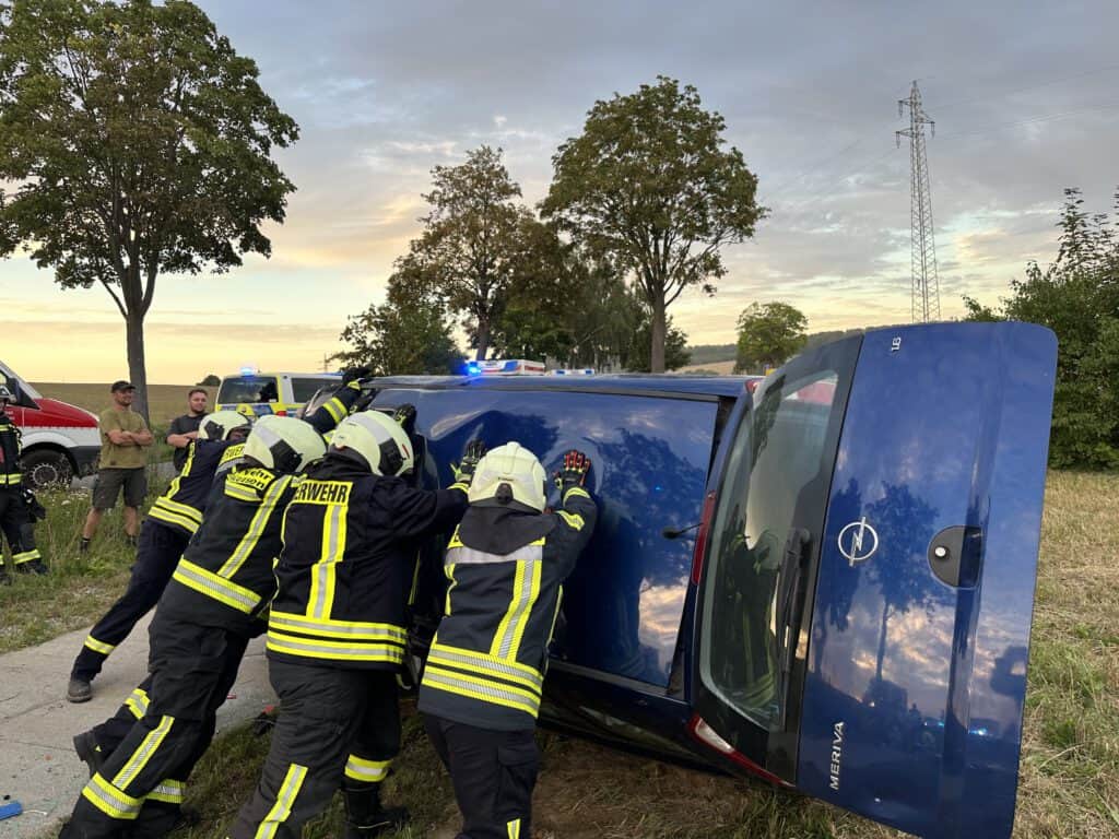 Vor Ort waren neben der Feuerwehr und der Polizei vier Rettungstransportwagen, ein Notfall-Krankentransportwagen, zwei Notarzt-Einsatzfahrzeuge und der Organisatorische Leiter Rettungsdienst des Landkreises. Das beim Eintreffen am Unfallort auf der Seite liegende Fahrzeug wurde nach Rettung und Behandlung der Verletzten aufgerichtet, die Batterie abgeklemmt und Trümmer zusammengefegt. Betriebsstoffe sind aus dem Fahrzeug nicht ausgetreten.