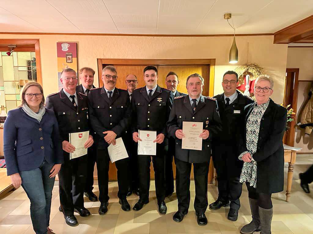 Am Abend konnten verdienten Mitgliedern auch Ehrungen und Beförderungen ausgesprochen werden. Heiner Müller wurde zum Hauptfeuerwehrmann, Johannes Müller zum Löschmeister befördert. Ehrungen gab es für Dietmar Uhde (60 Jahre) und Axel Kammer (25 Jahre).