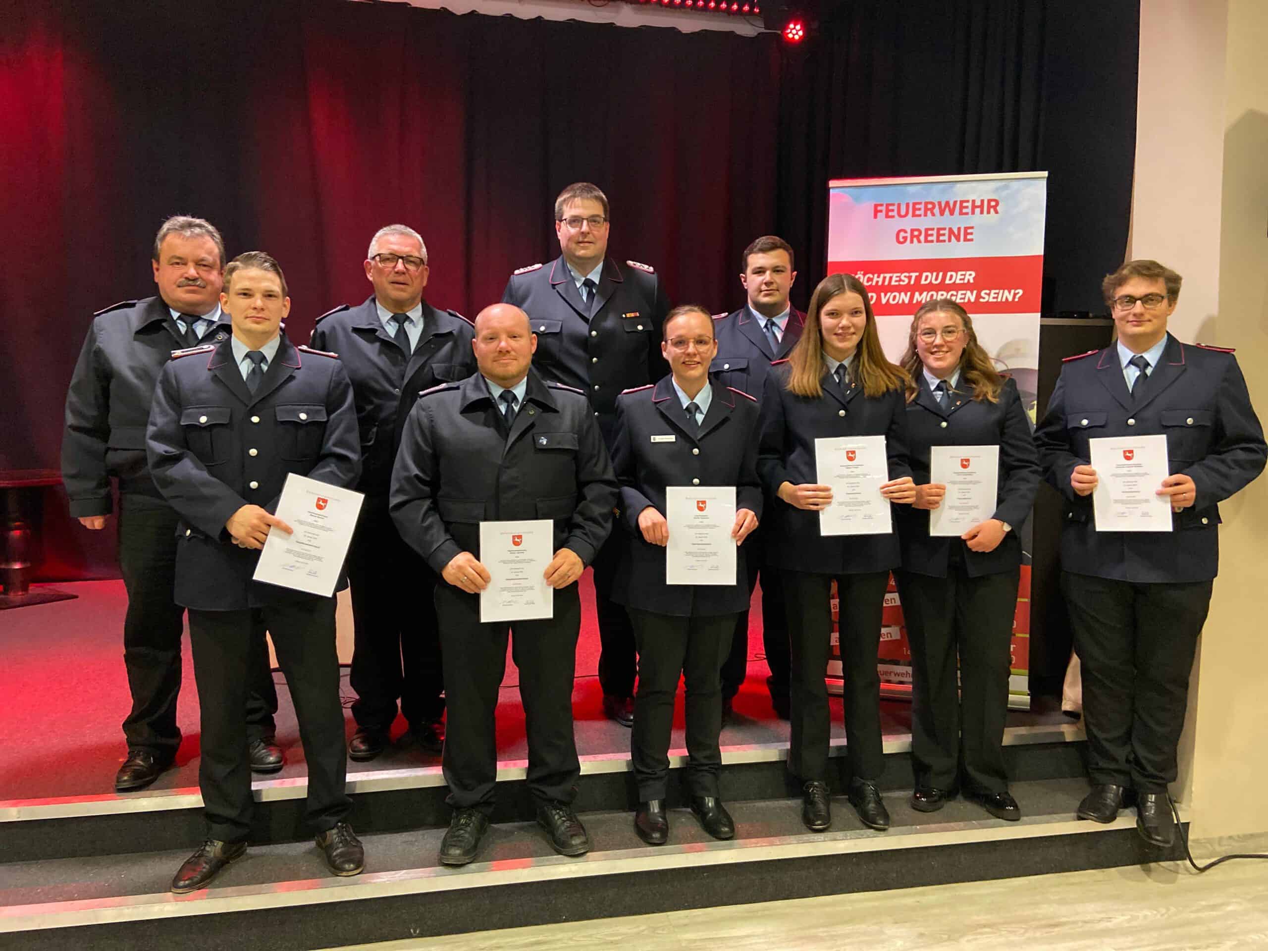 Ortsbrandmeister Frank Kubieniec konnte am Abend im Landhaus Greene verdiente Mitglieder ehren und befördern. Befördert wurden Clara Freudenstein und Tatjana Traupe zu Feuerwehrfrauen, Johannis Stanislav zum Feuerwehrmann, Maximilian Durau zum Oberfeuerwehrmann, Stefan Jeschke, Peter Penkalla und Marcel Sprecht zu Hauptfeuerwehrmännern und Annika Kubieniec zur Oberlöschmeisterin.