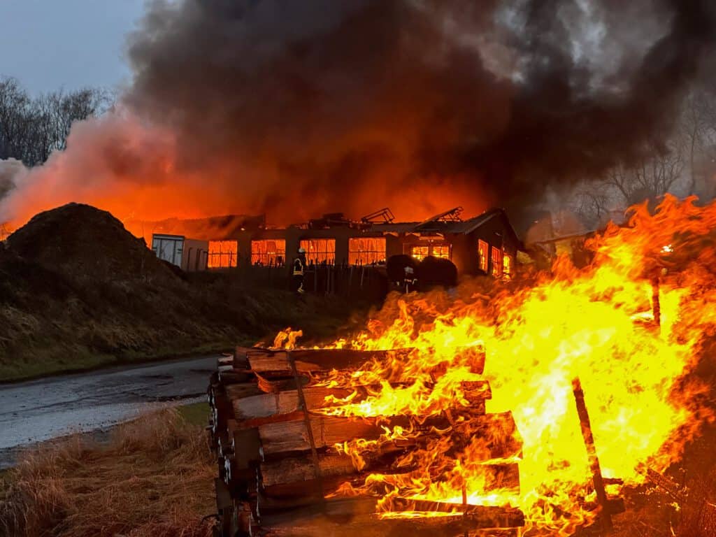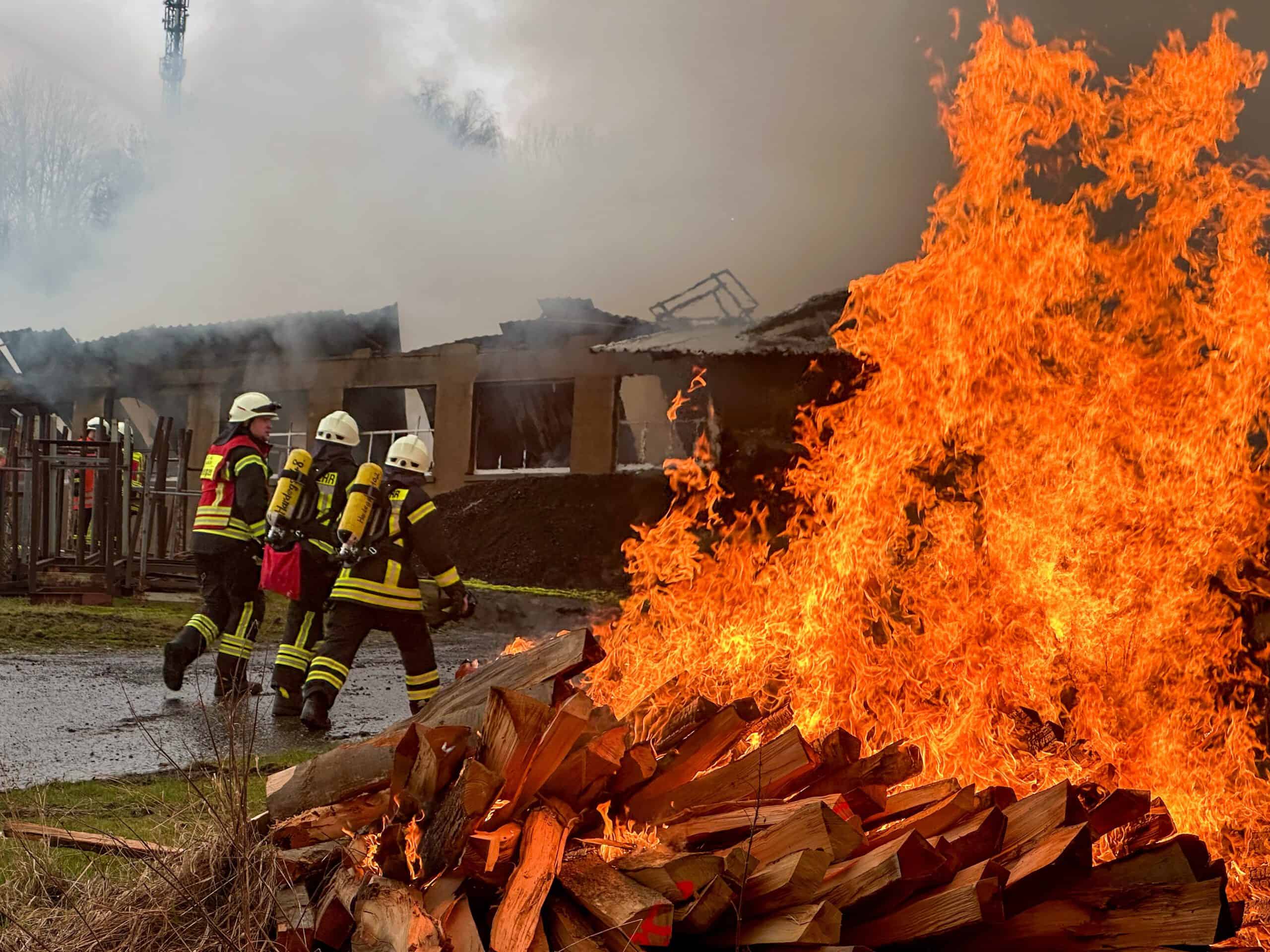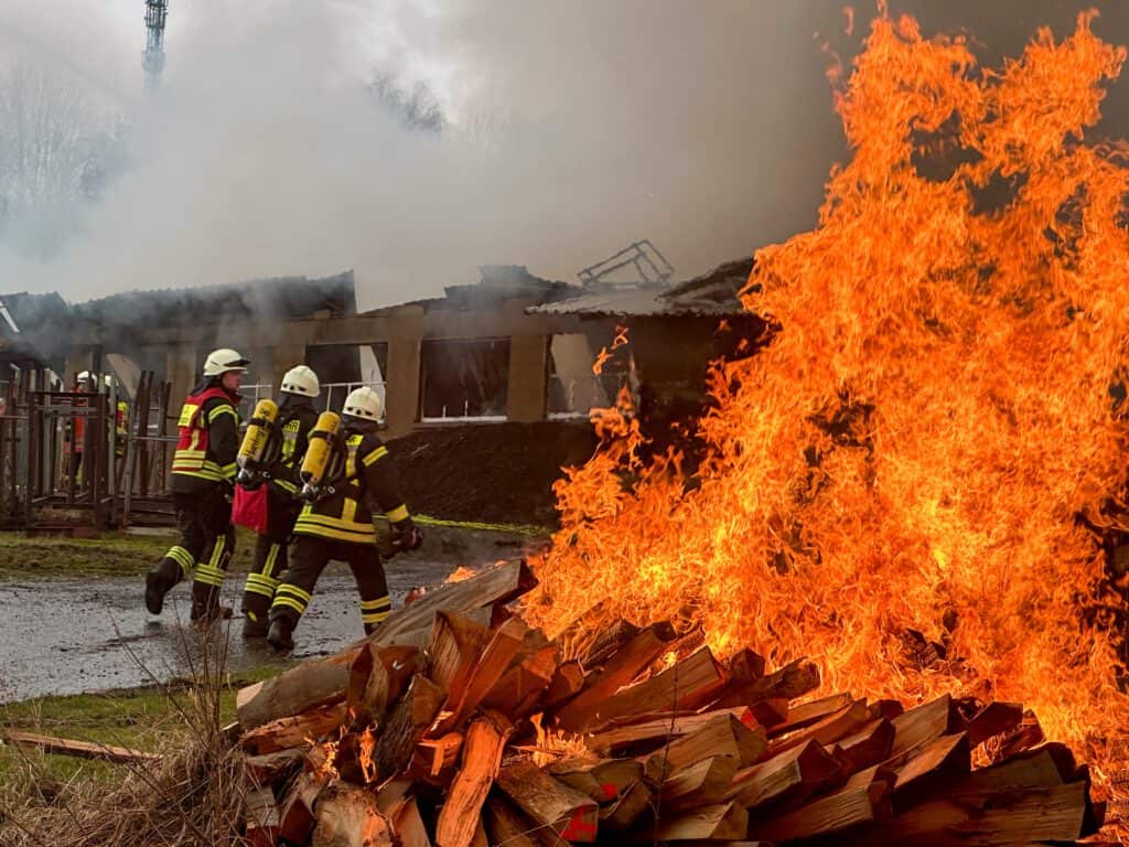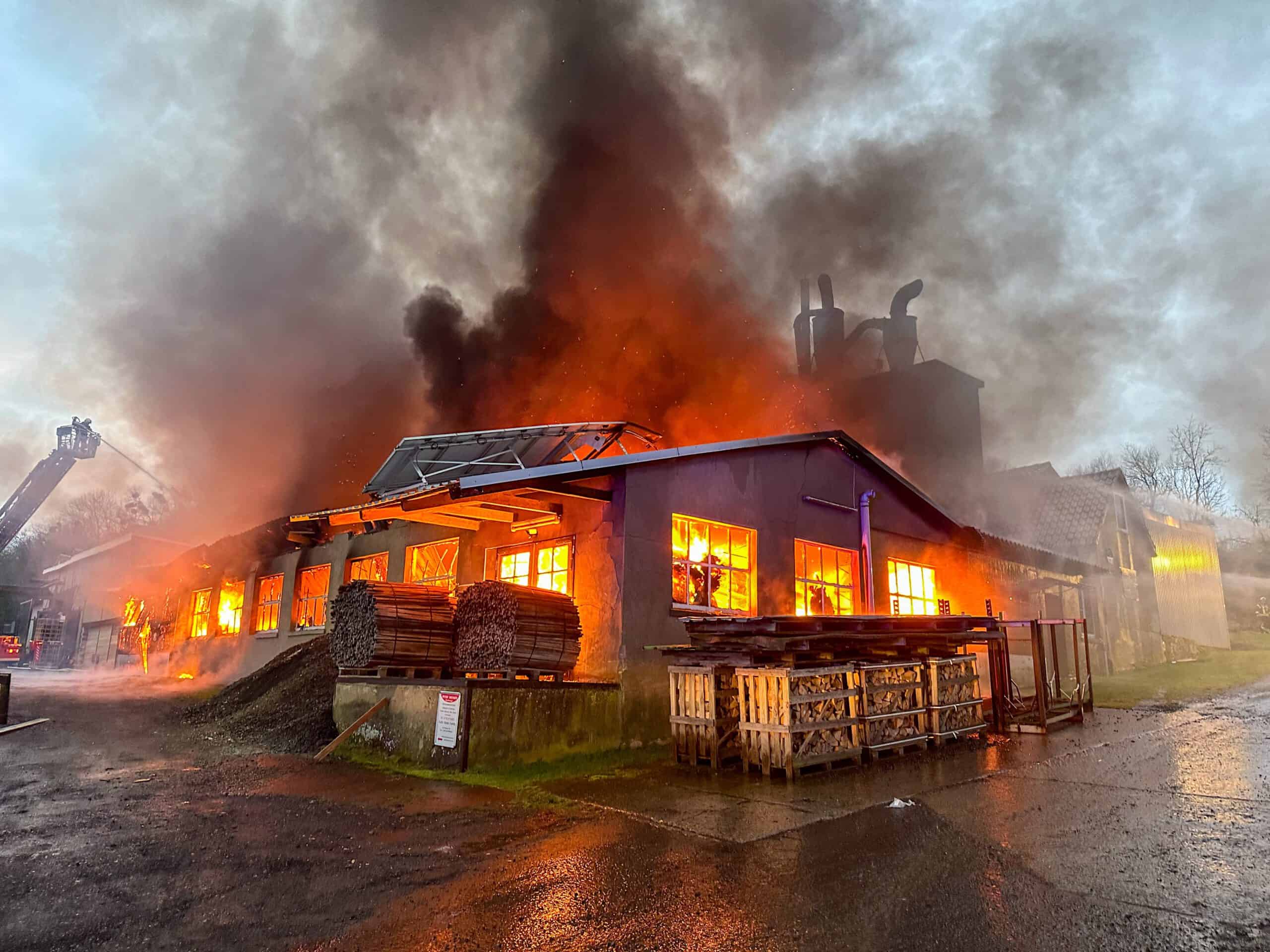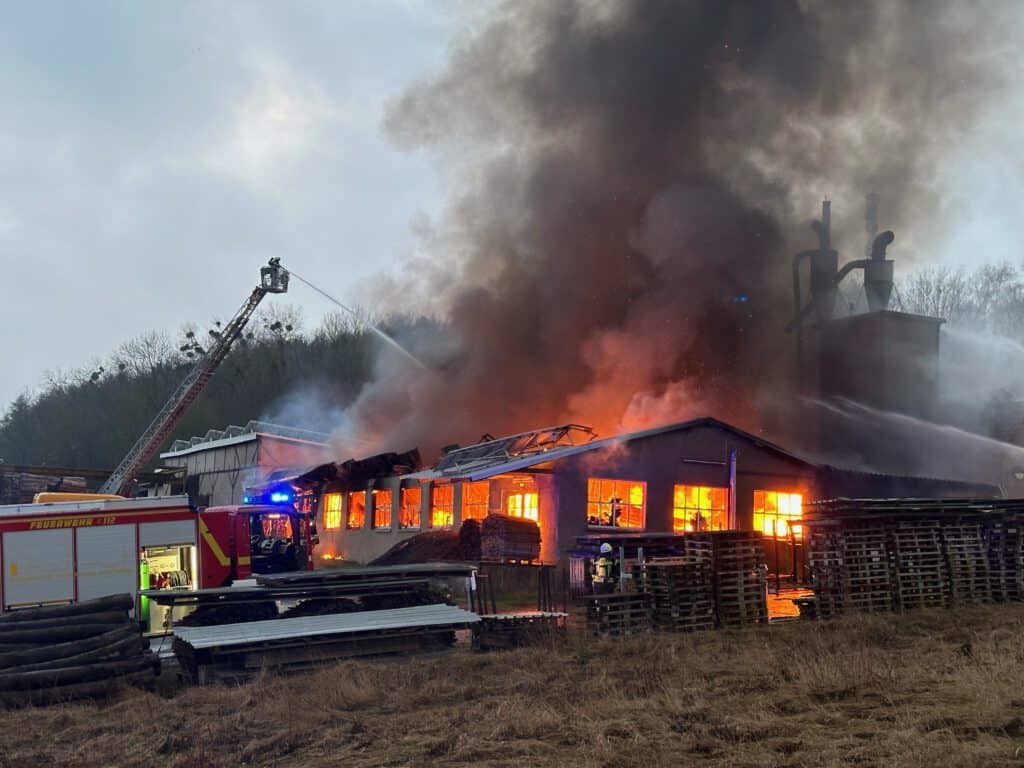 Autofahrer haben am Donnerstagmorgen gegen 7 Uhr Flammenschein auf dem Gelände eines Sägewerks bemerkt. Ersteintreffende Kräfte konnten das Feuer bestätigen – Flammen schlugen bereits aus dem Dach einer Lagerhalle. Umgehend wurde das Alarmstichwort von “Freiflächenbrand” auf “Gebäudebrand” erhöht.