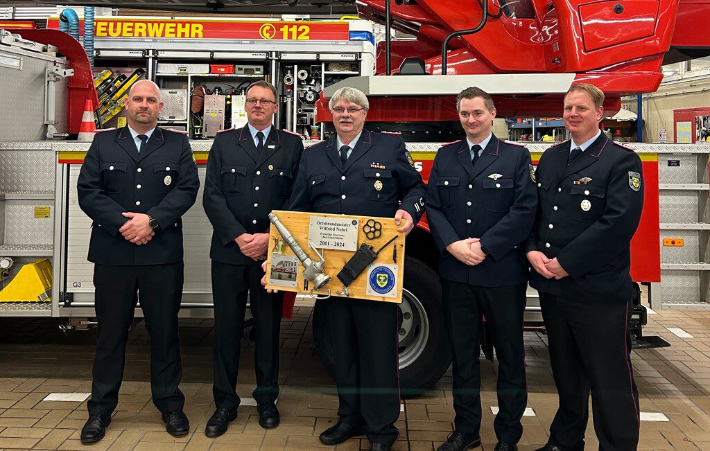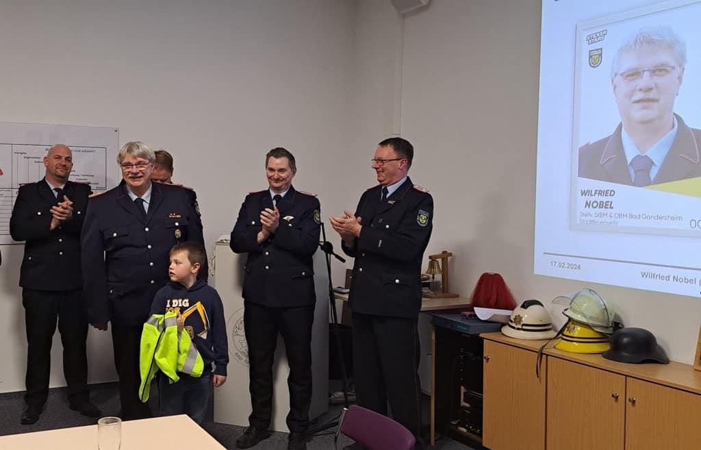 Die Schwerpunktfeuerwehr Feuerwehr Bad Gandersheim bedankt sich bei seinem Ortsbrandmeister Wilfried Nobel für die tollen 23 Jahre mit einem Gedenkbrett. In seiner Zeit von 2001 bis 2024 wurden unter seiner Führung 3011 Einsätze abgearbeitet. Aufgeteilt in: 10 Großbrände, 51 Mittelbrände, 96 Kleinbrände, 146 Entstehungsbrände, 229 nachbarschaftliche Löschhilfen, 1733 technische Hilfeleistungen und 746 blinde Alarme. Unter seiner Führung wurden insgesamt 211.000 Stunden geleistete Arbeit absolviert. Der Abschied ist für alle Seiten sehr emotional und es herrscht reger Applaus.