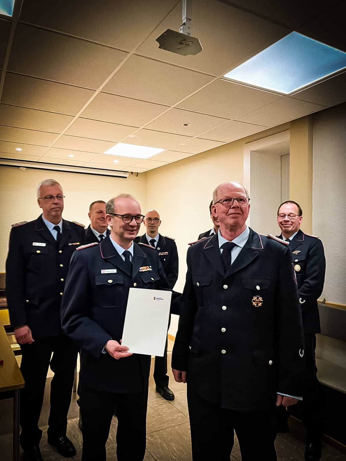 Auch Ehrungen und Beförderungen konnten ausgesprochen werden. Der Feuerwehrmann Daniel Schmidt wurde aufgrund seiner Dienstzeit durch Stadtbrandmeister Thomas Pleßmann zum Oberfeuerwehrmann befördert. Für 25 Jahre fördernde Mitgliedschaft sollten Gerald Hengst und Frithjof Bense geehrt werden, die beide bei der Jahreshauptversammlung nicht anwesend sein konnten.