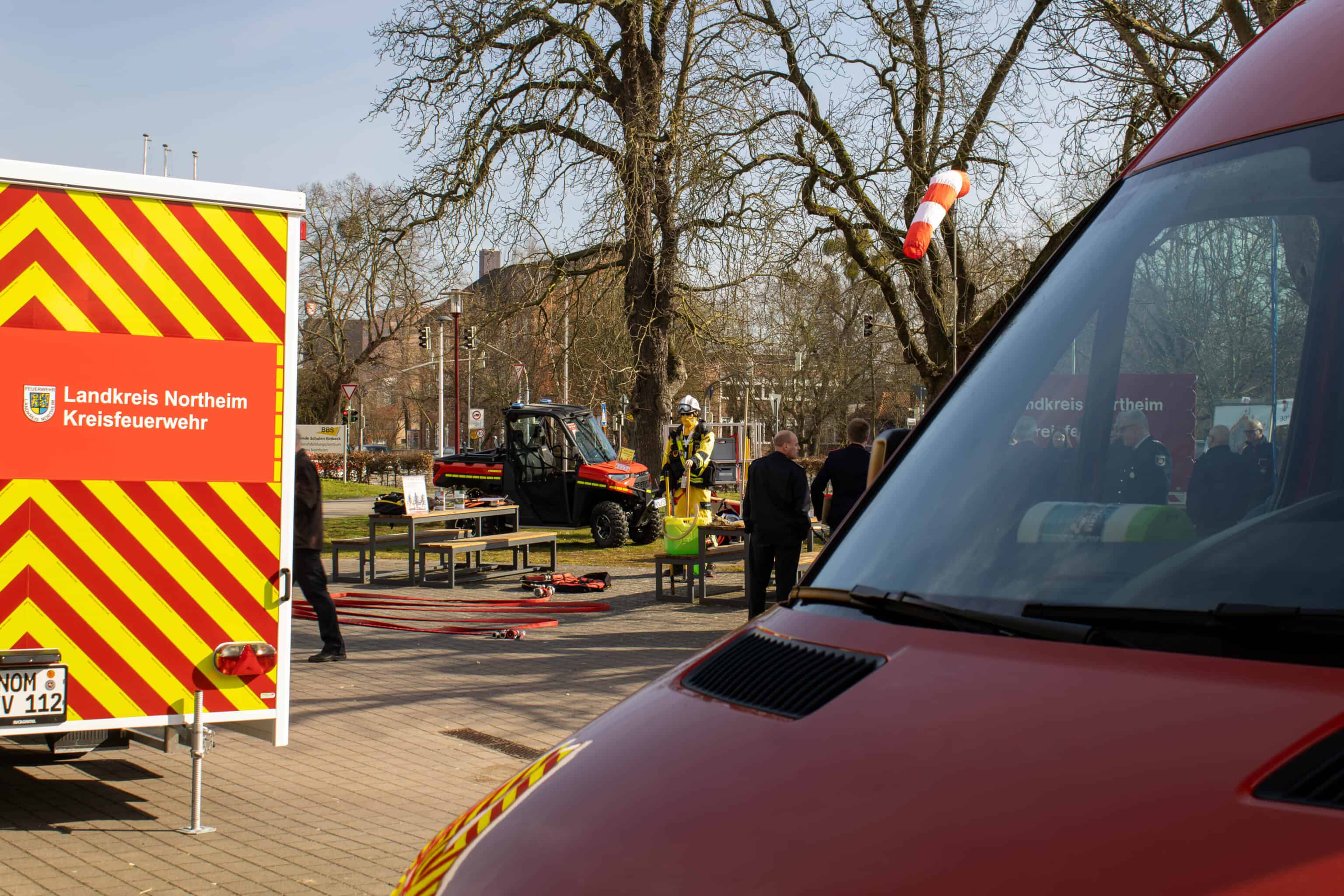 Spannende Einblicke ermöglichte der anschließende Praxisteil rund um das Forum der BBS auf der Außenfläche. Dort haben unter anderem die Stadtgebiete Bad Gandersheim, Einbeck, Moringen, Northeim und Nörten-Hardenberg aktuelle Fahrzeuge präsentiert, darunter das erst wenige Monate alte, geländegängige Tanklöschfahrzeug 3000 aus Bishausen auf Unimog-Fahrgestell. Die Kreisfeuerwehr als Einheit des Landkreises hatte gleich diverse Neuerungen im Gepäck. Die Technische Einsatzleitung hatte ihre neuen Kommunikationsmöglichkeiten per Satellit im Gepäck, die Kreisfeuerwehrbereitschaft 1 konnte die erweiterten Möglichkeiten zur Wald- und Vegetationsbrandbekämpfung vorstellen. Wie bei Unfällen im Bahnbereich vorgegangen werden kann, hat die Kreisfeuerwehrbereitschaft 2 erklärt und entsprechendes Material vorgestellt. Die Vielfalt an Einsatzmöglichkeiten konnte einmal mehr die Kreisfeuerwehrbereitschaft 4 mit ihren unterschiedlichsten Pumpen, Kran und mehr darstellen.