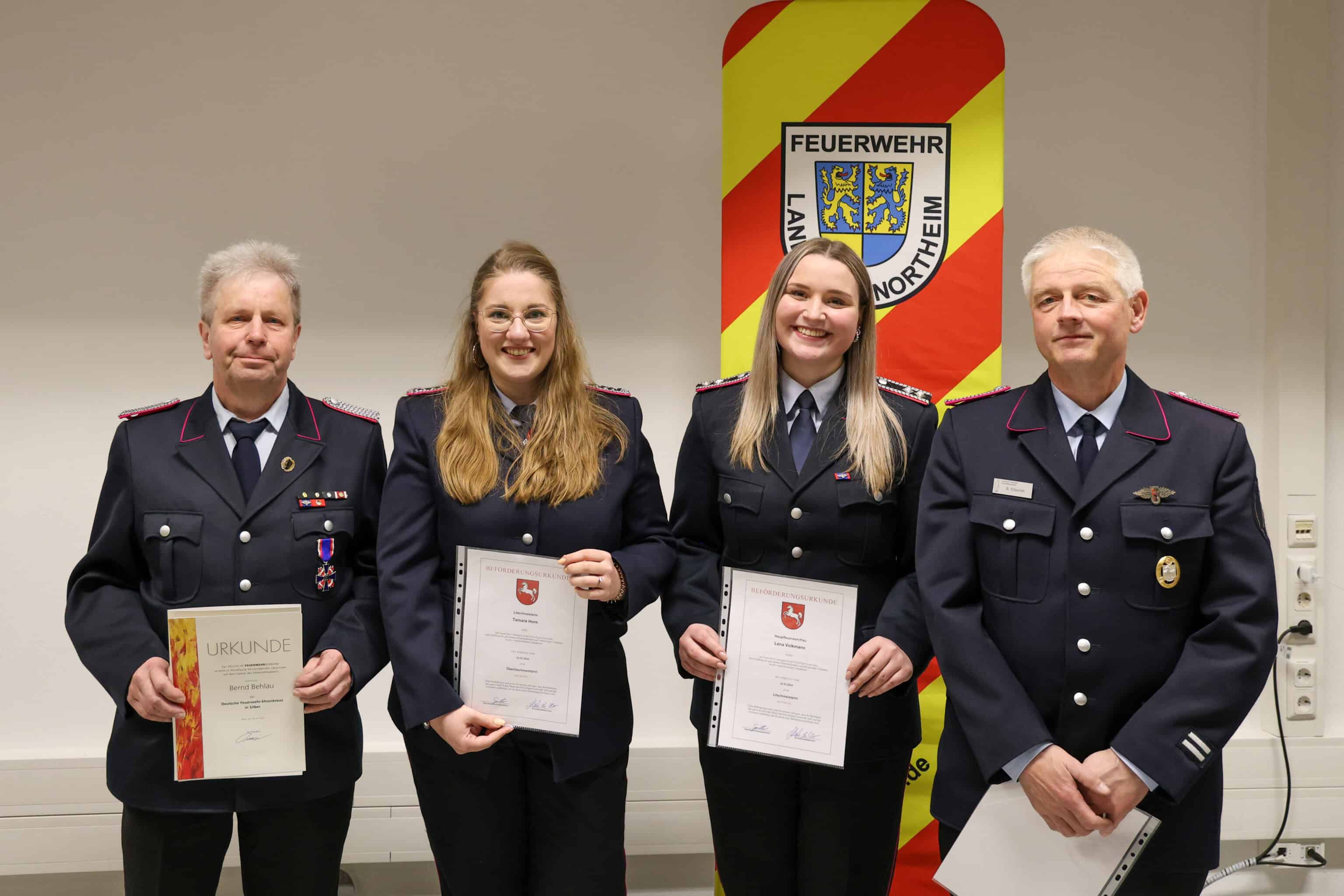 Brandmeister Bernd Behlau hat das Deutsche Feuerwehr-Ehrenkreuz in Silber erhalten. Hauptfeuerwehrfrau Lena Volkmann wurde zur Löschmeisterin befördert. Löschmeisterin Tamara Horn hat die Beförderung zur Oberlöschmeisterin erhalten. Northeims stellvertretender Stadtbrandmeister Bernd Ellieroth wurde zum Oberbrandmeister befördert.
