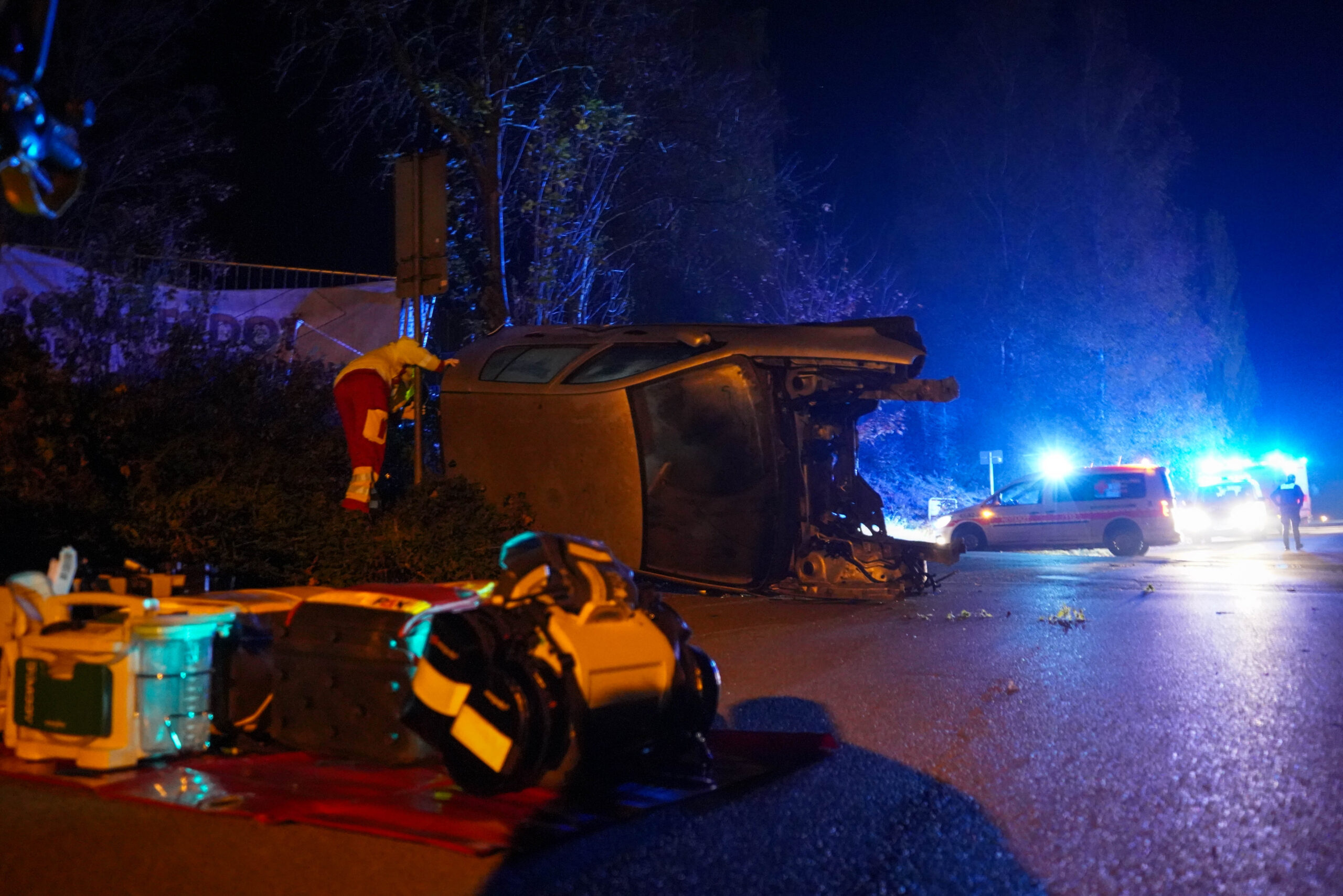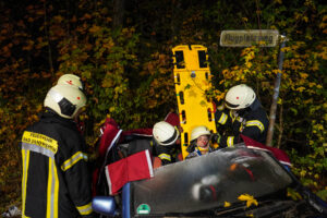 Die Feuerwehr Bad Gandersheim rückte kurze Zeit später mit schwerem technischem Gerät an. Am auf der Seite liegenden Fahrzeug entfernten die Einsatzkräfte die Windschutzscheibe, um Zugang zum Patienten zu schaffen. Dadurch konnte die Person rasch und schonend aus dem Fahrzeug befreit und dem Rettungsdienst übergeben werden. Dieser betreute den Patienten während der gesamten Zeit im Fahrzeug.