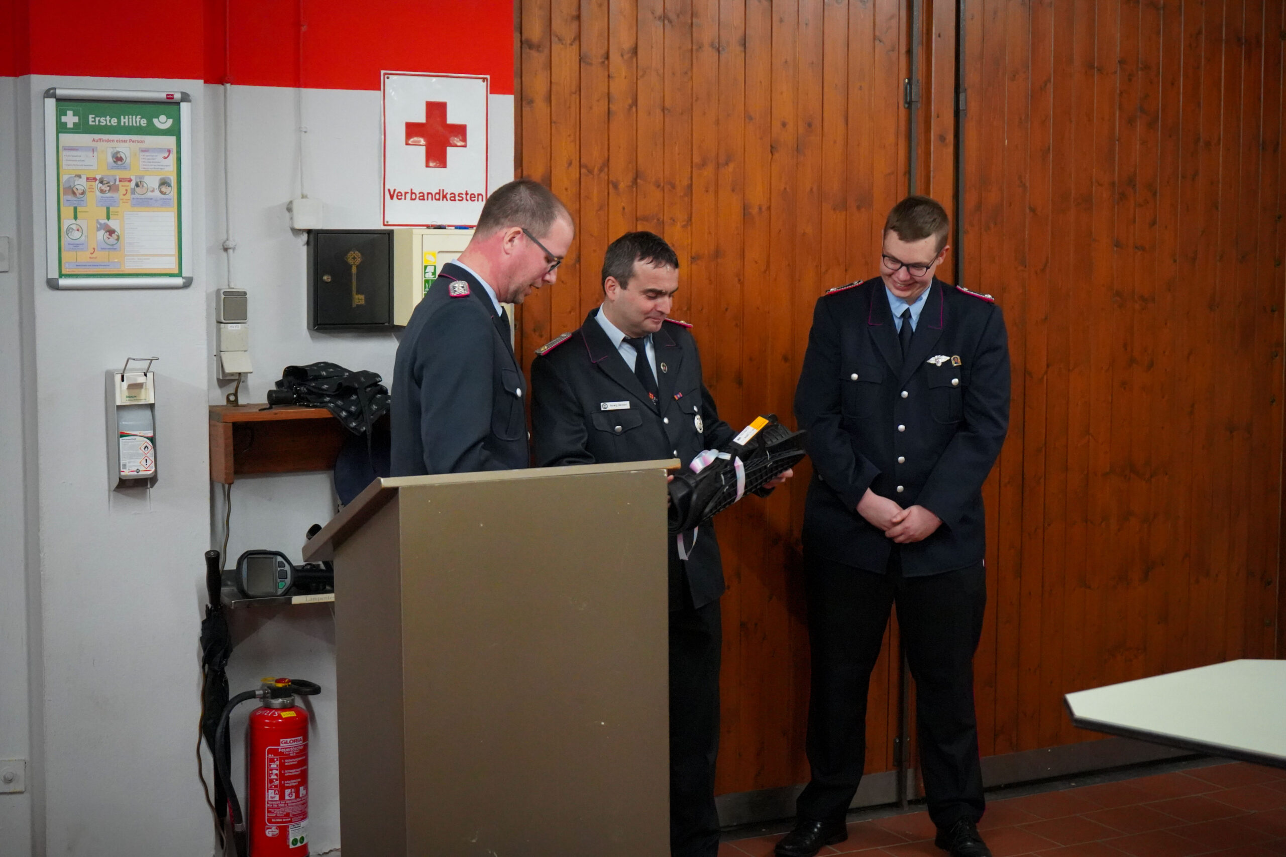 Von Seiten der Feuerwehr richteten Abschnittsleiter Carsten Winkler, stellvertretender Abschnittsleiter Karsten Müller und Gemeindebrandmeister Jan Bialaschewitz Worte an die Versammlung. Karsten Müller überreichte ein kleines Präsent an die Kameraden der Feuerwehr Düderode. Jan Bialaschewitz berichtete von seinen Erinnerungen aus der Jugendfeuerwehrzeit, als das inzwischen alte TSF-W angeschafft wurde. Die damalige Begeisterung für das Fahrzeug und dessen Bedeutung ließ er in seiner Rede wieder aufleben.