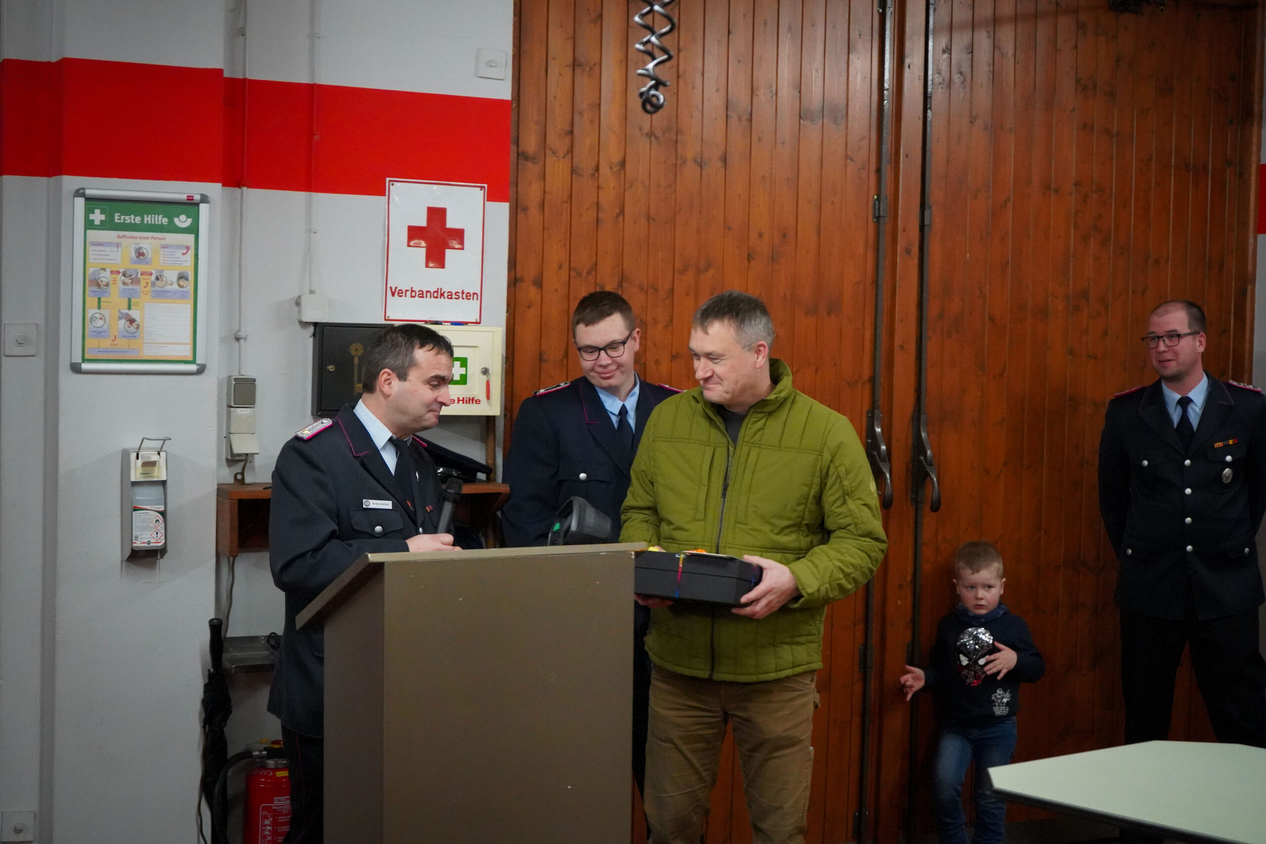 Ortsbrandmeister Zwickert betonte in seiner Ansprache die immense Bedeutung der Wärmebildkamera für Einsätze der Feuerwehr: „Insbesondere für Einsatzkräfte unter Atemschutz ermöglicht sie es, Brände schneller und gezielter zu löschen und vermisste Personen in verrauchten oder dunklen Umgebungen effizient zu finden.“