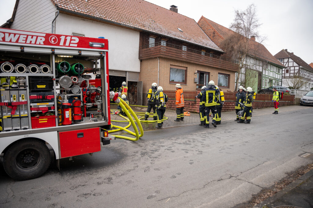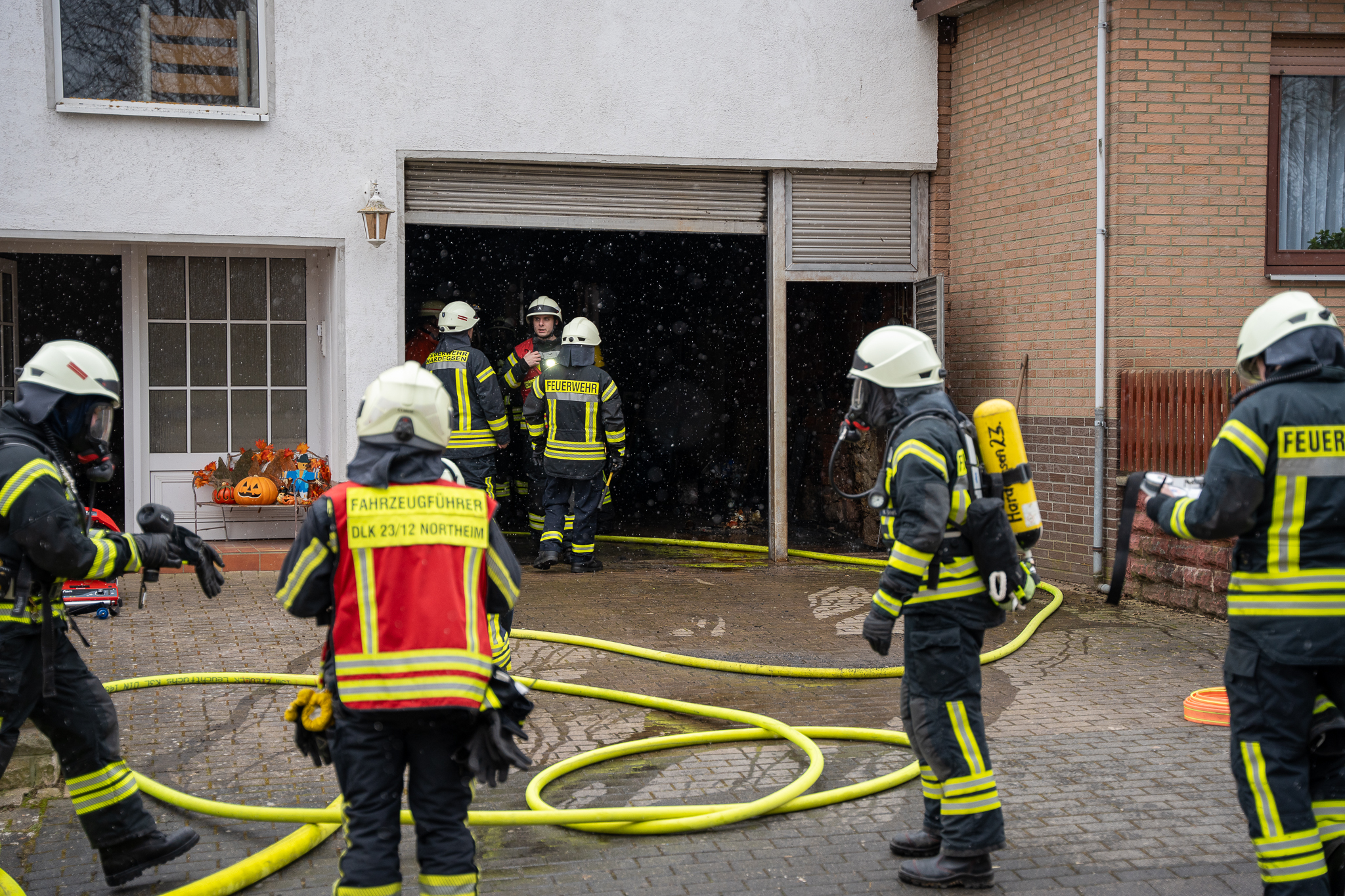 Die Einsatzkräfte konnten schnell einen Kleinbrand in einer angrenzenden Garage lokalisieren. Ein Trupp unter umluftunabhängigem Atemschutz löschte den Brand zügig und brachte das Brandgut ins Freie. Zur Sicherheit der eingesetzten Feuerwehrkräfte war auch der ASB (Arbeiter-Samariter-Bund) vor Ort.