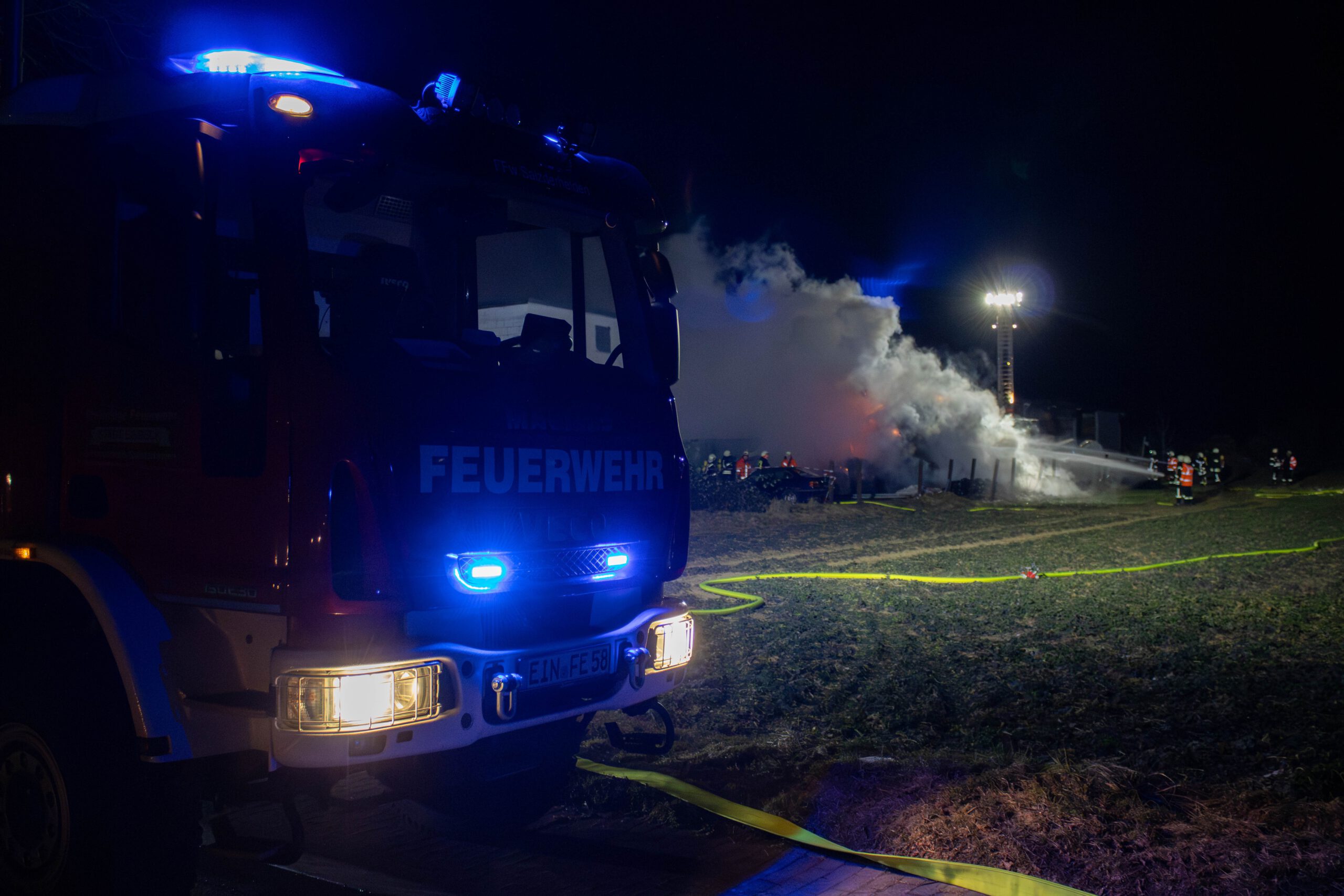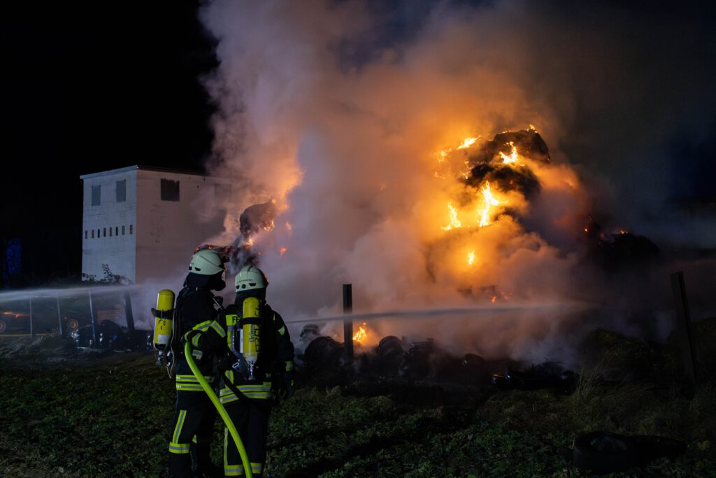 Gegen 1.20 Uhr hatte ein Anrufer eine unklare Rauchentwicklung und Feuerschein im Bereich Altes Sägewerk in Strodthagen gemeldet. Beim Eintreffen der ersten Kräfte wenige Minuten später bestätigte sich diese Meldung. Rund 150 Rundballen brannten auf freier Fläche.