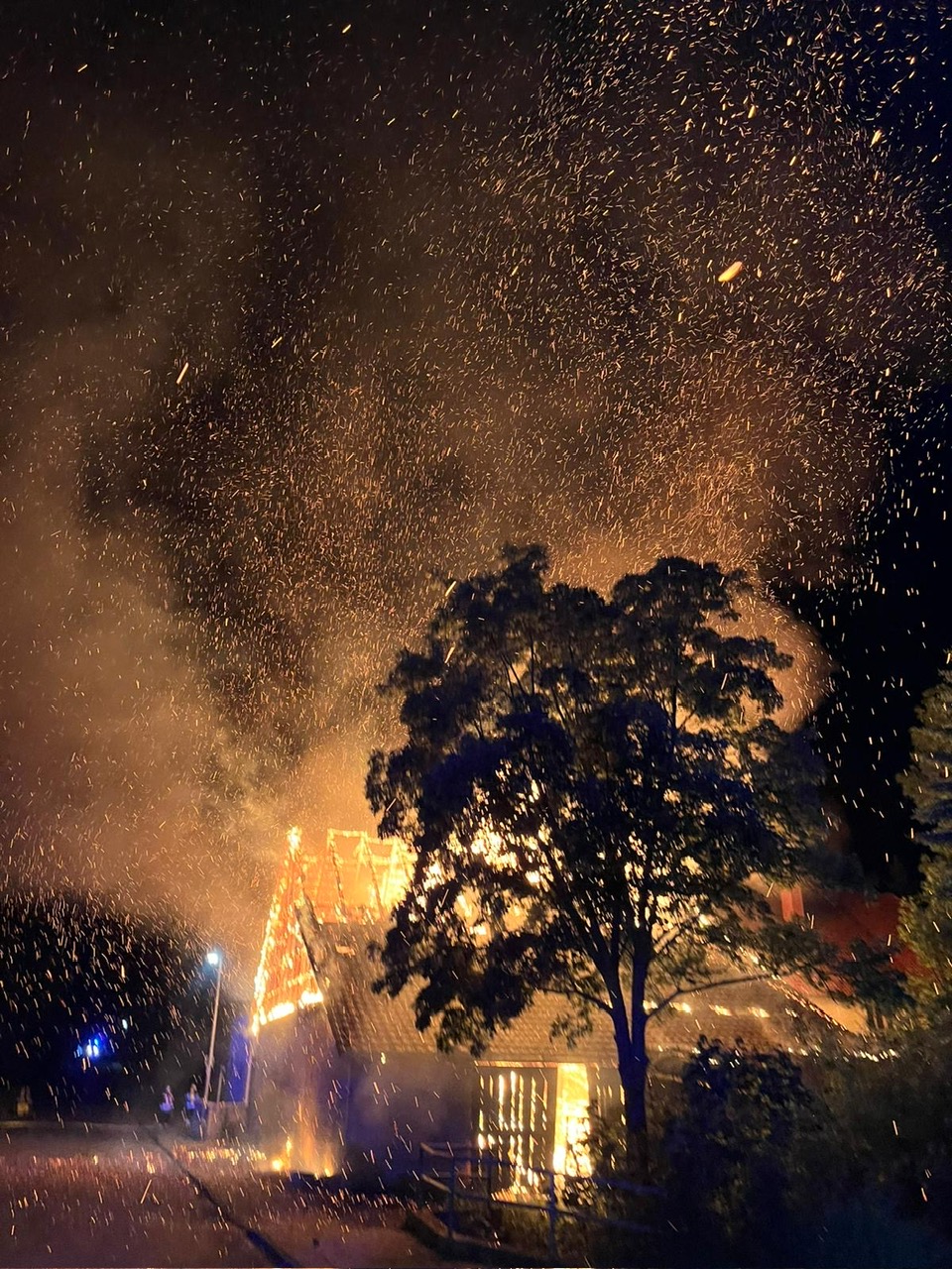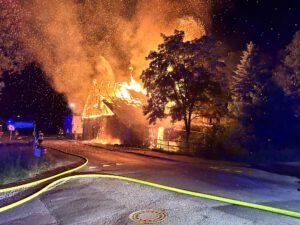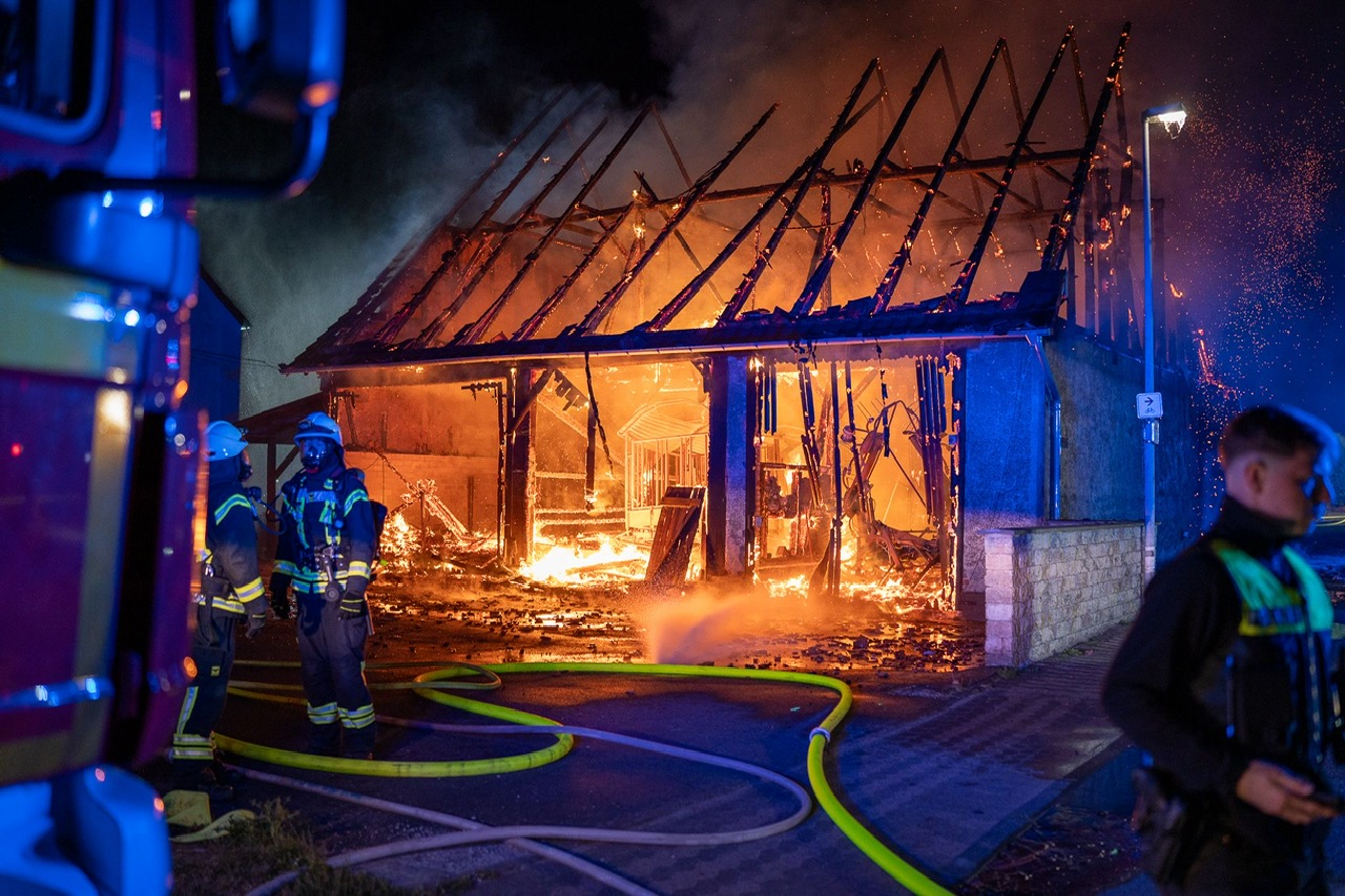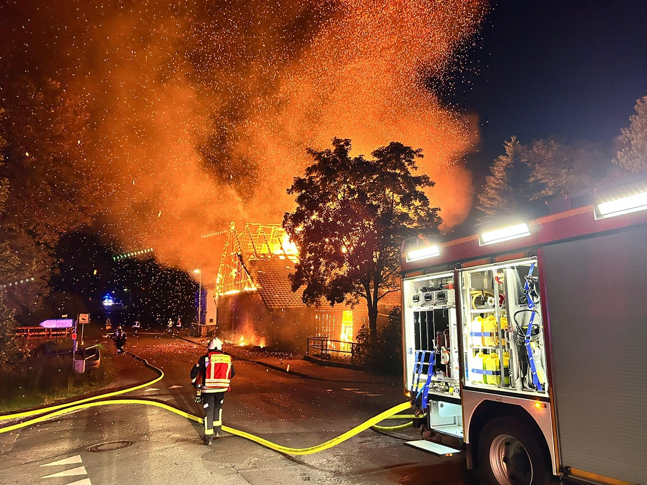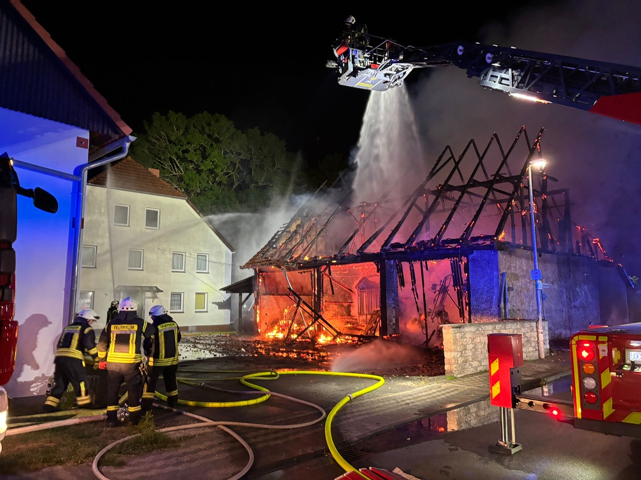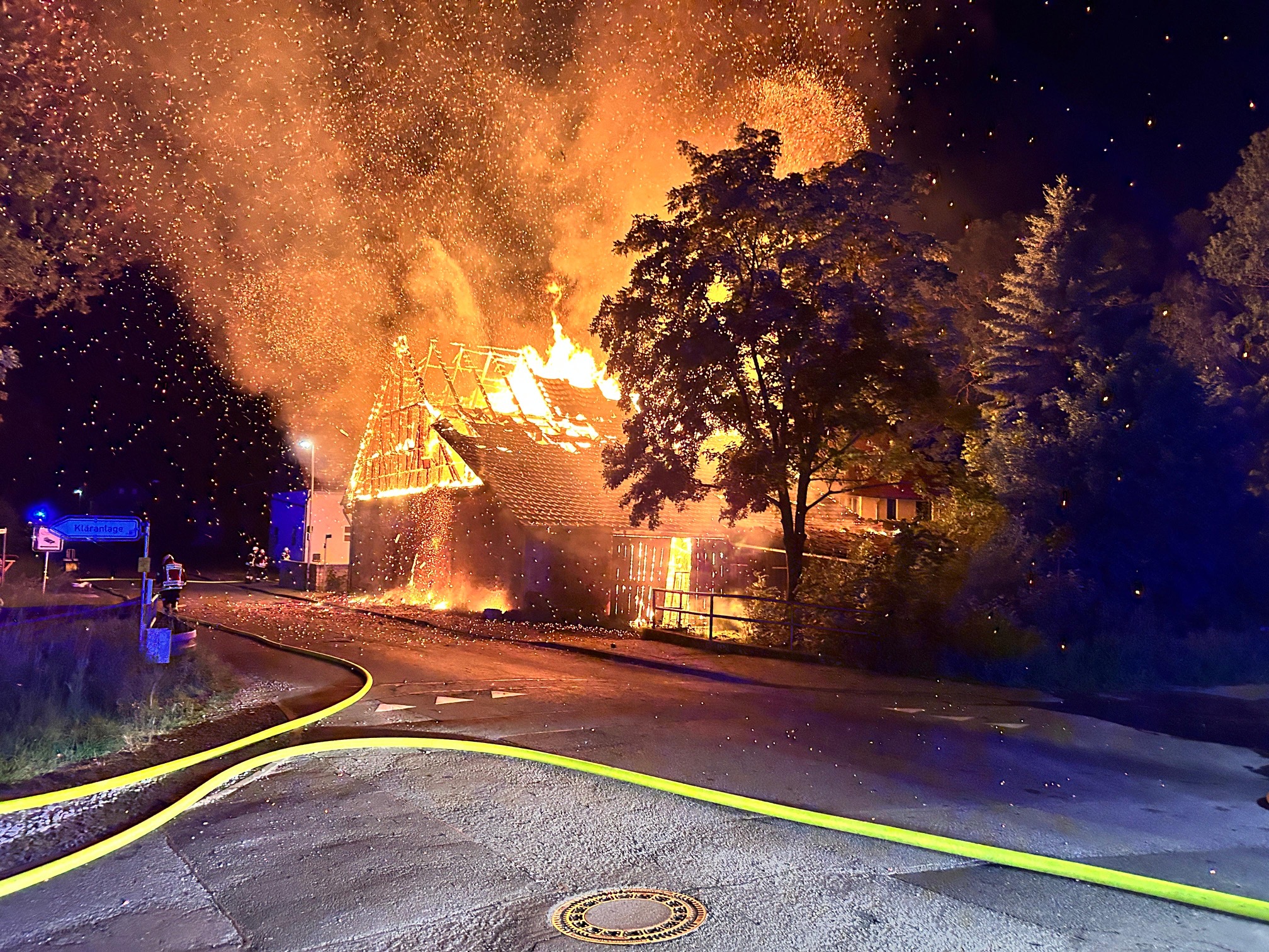 Bereits auf der Anfahrt konnten die Einsatzkräfte einen massiven Feuerschein mit meterhohen Flammen und starkem Funkenflug wahrnehmen. Beim Eintreffen stand die Scheune bereits in Vollbrand und drohte auf benachbarte Gebäude überzugreifen, wie Stadtbrandmeister und Einsatzleiter Stefan Lange berichtet.