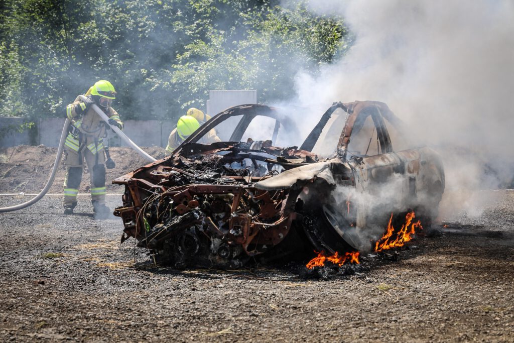 Im Anschluss an die Ehrung wartete eine Überraschung auf den scheidenden Bereitschaftsführer: eine aufwendig inszenierte Abschlussübung auf dem landwirtschaftlichen Anwesen von Heino Freudenstein in der Ortschaft Greene. Angenommen wurde ein herausforderndes Szenario: Ein brennender PKW auf dem Hof drohte auf eine angrenzende Scheune überzugreifen. Fast zeitgleich kam es durch einen Kurzschluss bei Reparaturarbeiten in der Maschinenhalle zu einer weiteren kritischen Lage – ein Techniker wurde schwer verletzt in der Trocknung eingeschlossen, während sich dichter Rauch ausbreitete. Besonders anspruchsvoll: Auf dem gesamten Gelände stand kein Löschwasser zur Verfügung, da eine Wasserleitung am Vortag durch Tiefbauarbeiten in der Naenser Straße beschädigt worden war.