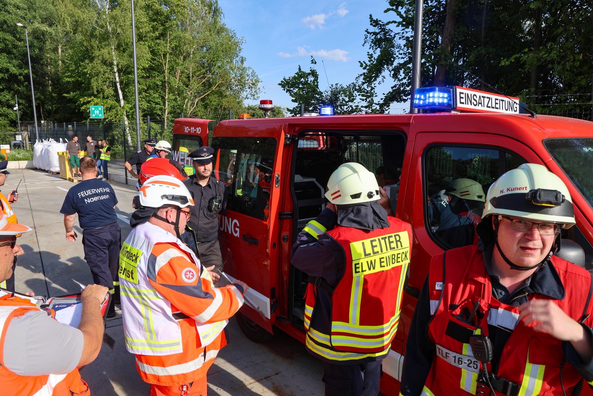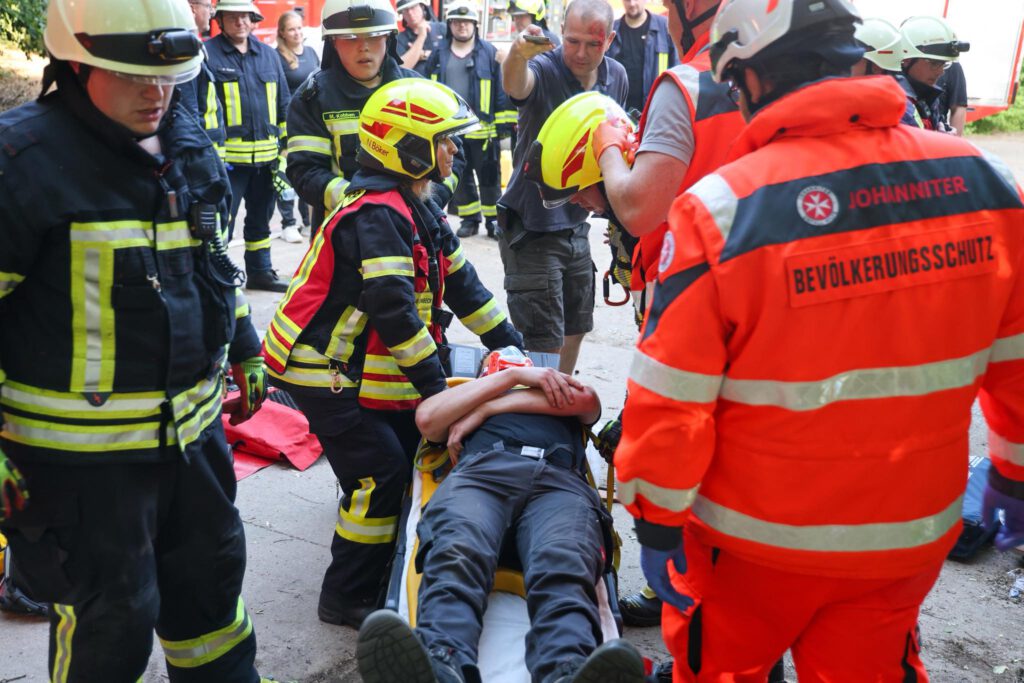 Insgesamt vier anspruchsvolle Szenarien galt es für die rund 300 Einsatzkräfte aus Feuerwehr, Rettungsdienst, THW, Polizei und Werkfeuerwehr zu bewältigen. Darunter ein ausgedehnter Gebäudebrand im KWS-Elitespeicher mit 22 vermissten Personen, ein schwerer Verkehrsunfall mit sechs Eingeklemmten, ein Wald- und Vegetationsbrand sowie die Rettung zweier verunglückter Wanderer aus unwegsamem Gelände.
