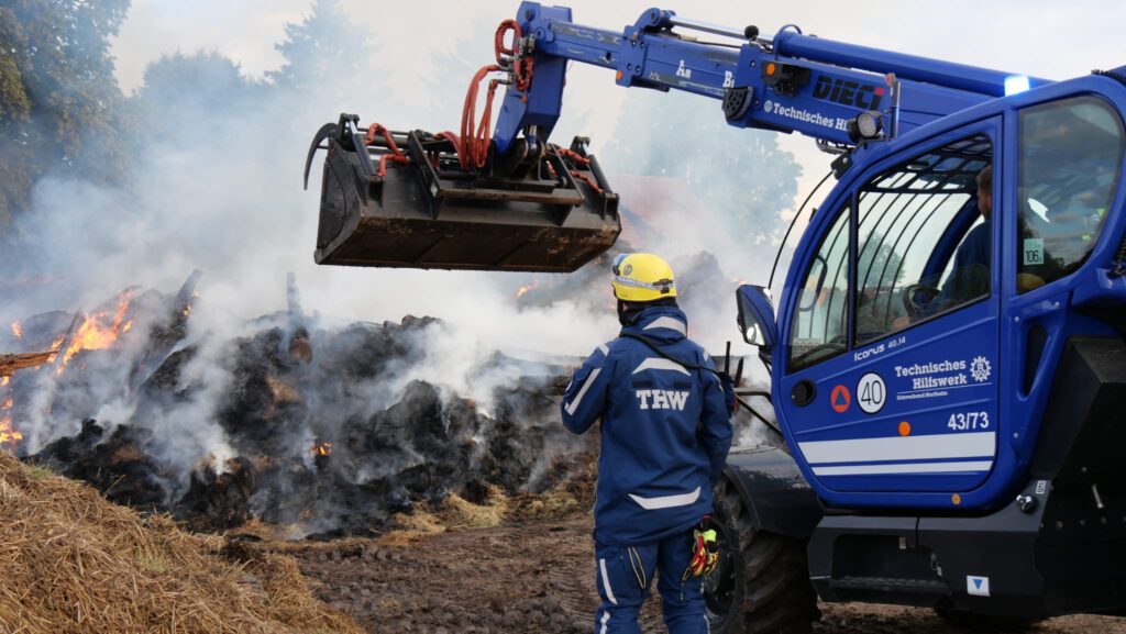 Bereits während der ersten Löschmaßnahmen unterstützte das Technische Hilfswerk (THW) Northeim die Feuerwehr mit seiner Wasserkomponente und stellte 14.500 Liter Löschwasser zur Verfügung, da sich die Wasserversorgung an der Einsatzstelle zunächst schwierig gestaltete. Um ein Übergreifen der Flammen zu verhindern, schuf das THW mit einem Telelader gezielt Schneisen. Gemeinsam mit dem Radlader des THW Clausthal-Zellerfeld wurden glühende Trümmer und Ballen auseinandergezogen und zum Ablöschen vorbereitet. Die Einheiten des THW rissen in Zusammenarbeit mit einem Abrissunternehmen Gebäudeteile gezielt ein, um Glutnester zu bekämpfen. Am Nachmittag wurde zudem ein Bagger des THW Elze zur weiteren Unterstützung angefordert.