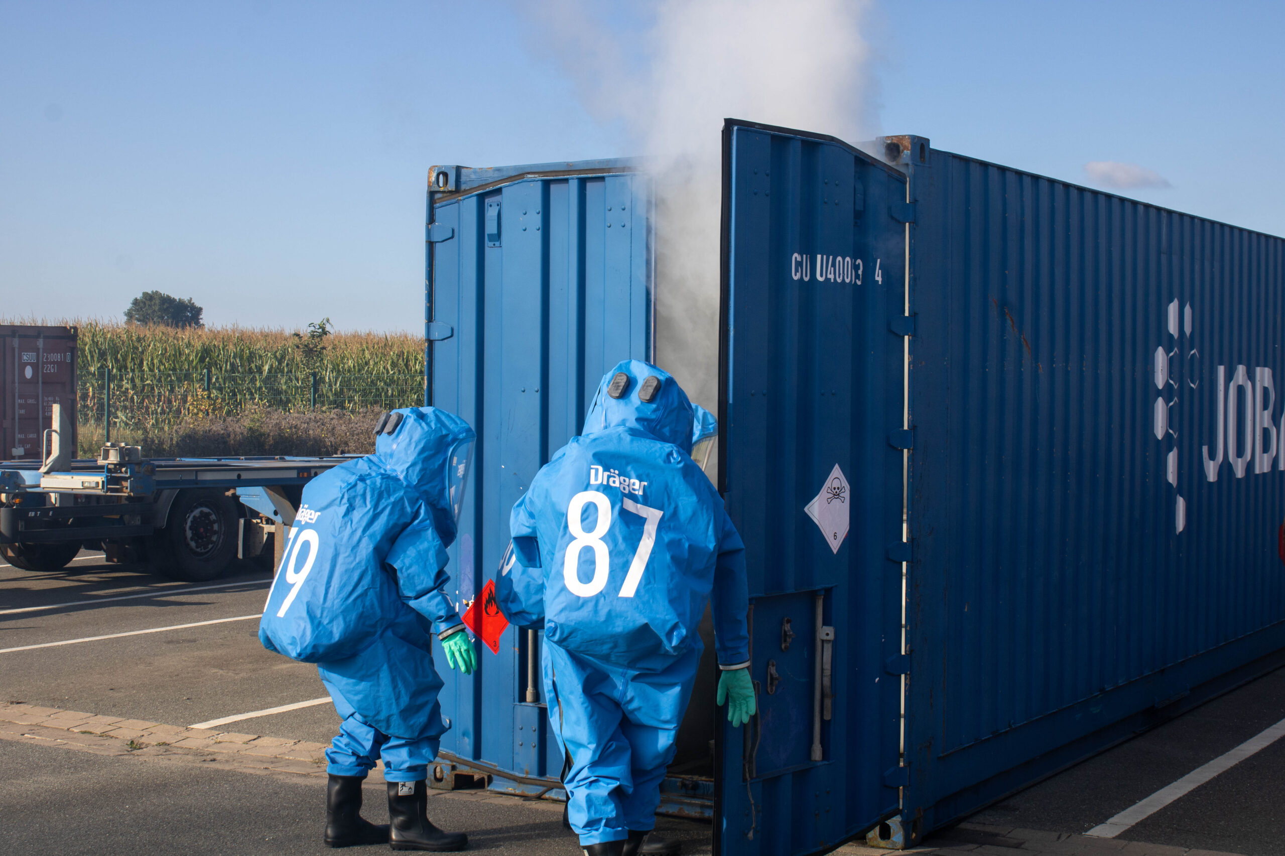 Ausgangspunkt der Übung war ein Container, aus dem Rauch austrat. Einsatzkräfte in speziellen Chemikalien-Schutzanzügen erkundeten die Lage, identifizierten den austretenden Stoff und leiteten Maßnahmen zur Eindämmung ein. Parallel dazu wurde eine umfassende Wasserversorgung aufgebaut und die Dekontamination – also die Reinigung der eingesetzten Kräfte – vorbereitet.