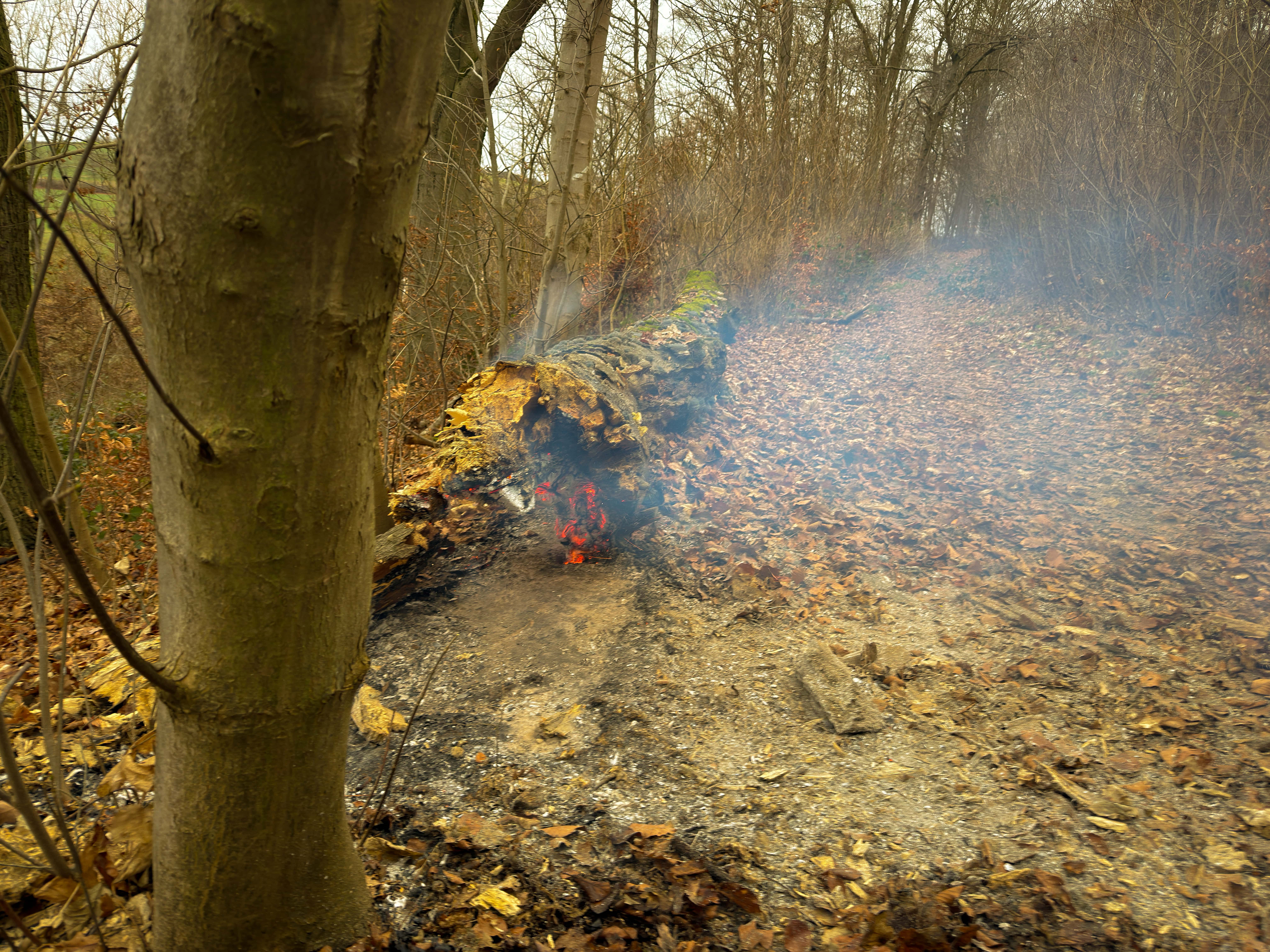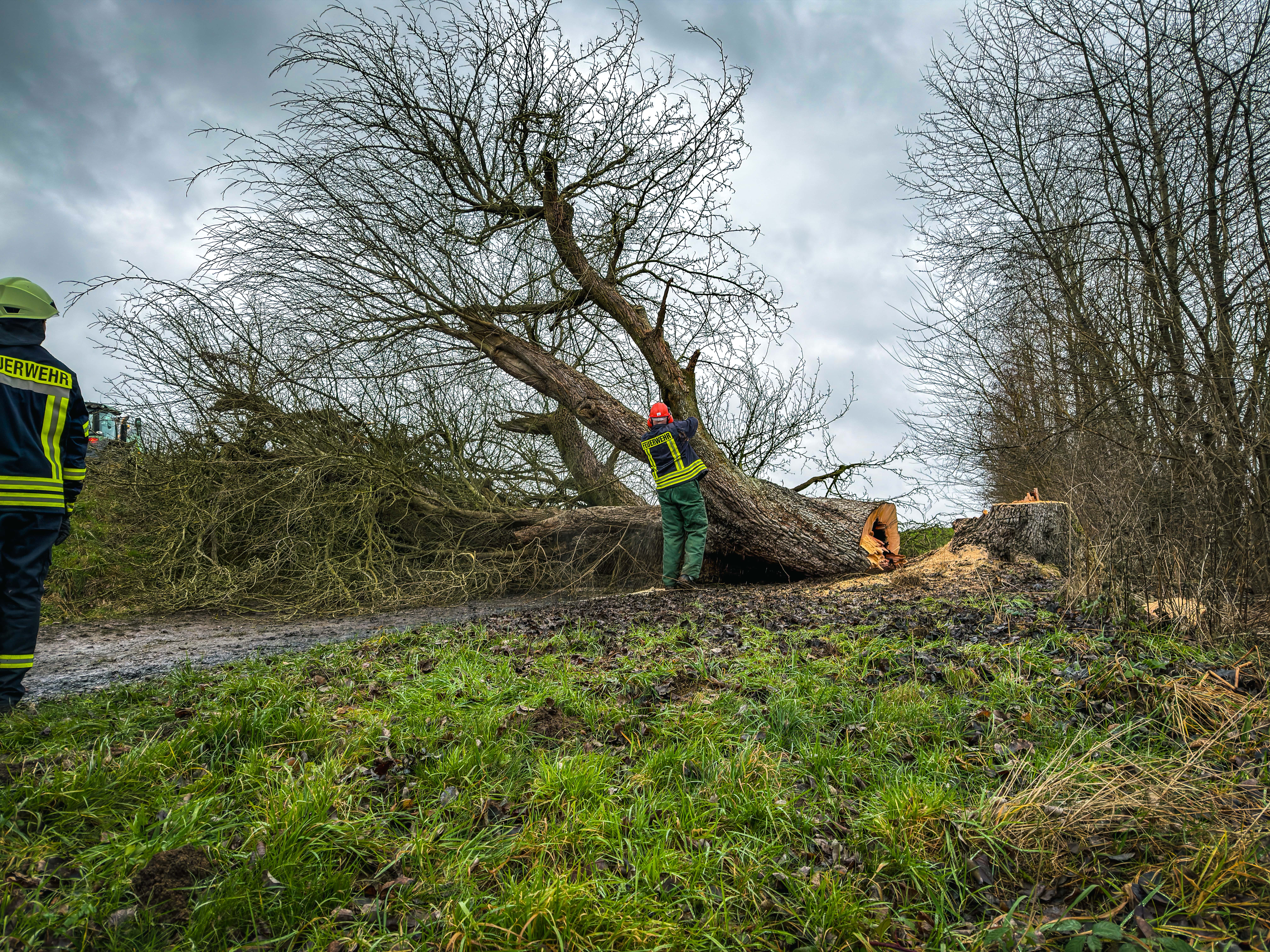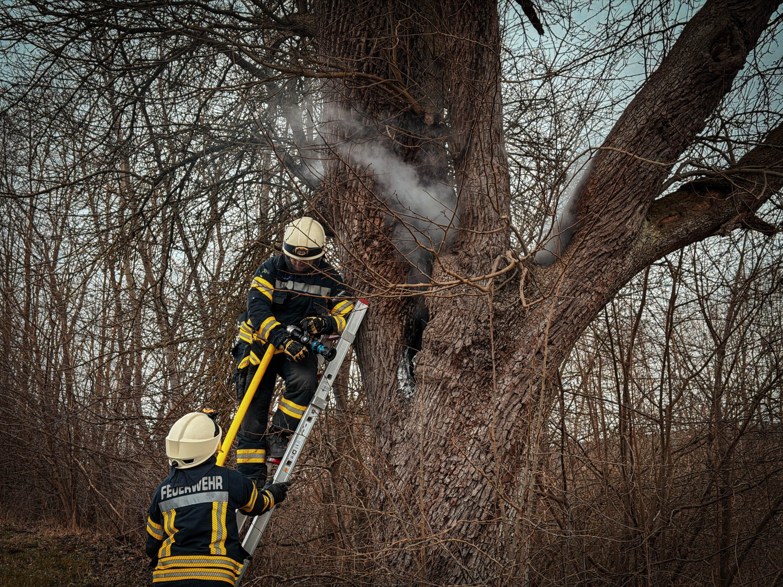Ein weiterer Einsatz folgte um 13:40 Uhr an einem Feldweg im Bereich Steimke bei Wiensen. Hier brannte der hohle Stamm eines größeren Baumes auf einem Feldweg parallel zur Bahnstrecke. Die Ortsfeuerwehren Wiensen und Uslar führten Löschmaßnahmen über natürliche Öffnungen durch. Eine Kontrolle mit der Wärmebildkamera zeigte jedoch wiederkehrende Glutnester. Zur Gefahrenabwehr wurde der Baum durch eine Fachkraft gefällt und anschließend vollständig abgelöscht.