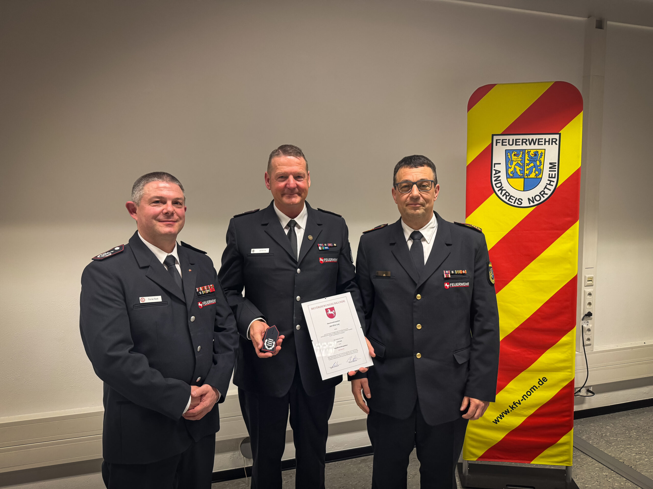 Für seinen Einsatz im Hochwasser 2024 wurde Jan Eric Loy mit der Hochwassermedalie Niedersachsen ausgezeichnet undzugleich in seiner Funktion als stellvertretender bereitschaftsführer zum Hauptbrandinspektor befördert.