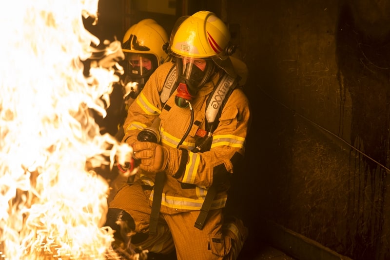 Zugang zur Brandübungsanlage: Ein Trupp unter Atemschutz an der “Hot Door”.