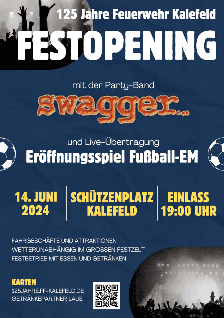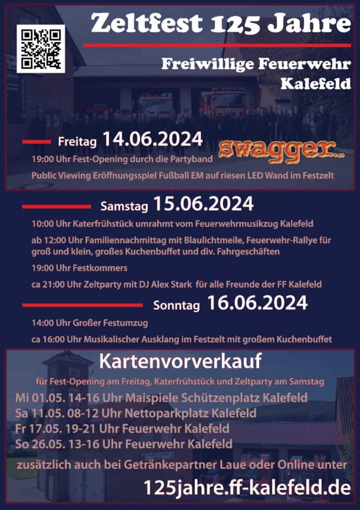 Die Freiwillige Feuerwehr Kalefeld wird stolze 125 Jahre alt! Diese beeindruckende Tradition möchten wir gemeinsam mit Ihnen gebührend zelebrieren. Deshalb laden wir Sie herzlich zu unserem großen Feuerwehrfest ein, das vom 14. Juni bis zum 16. Juni 2024 in Kalefeld stattfindet.